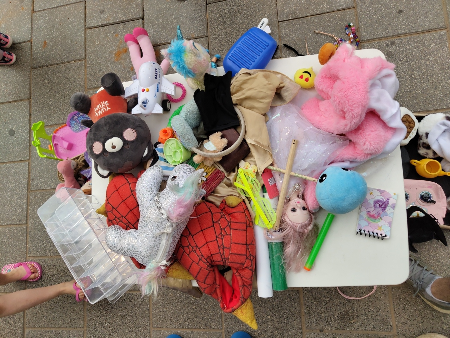 A top-down view reveals a cluttered white folding table on an outdoor stone-tiled surface, likely a sidewalk or patio. The table is covered in a variety of toys and other objects, including stuffed an…read more
