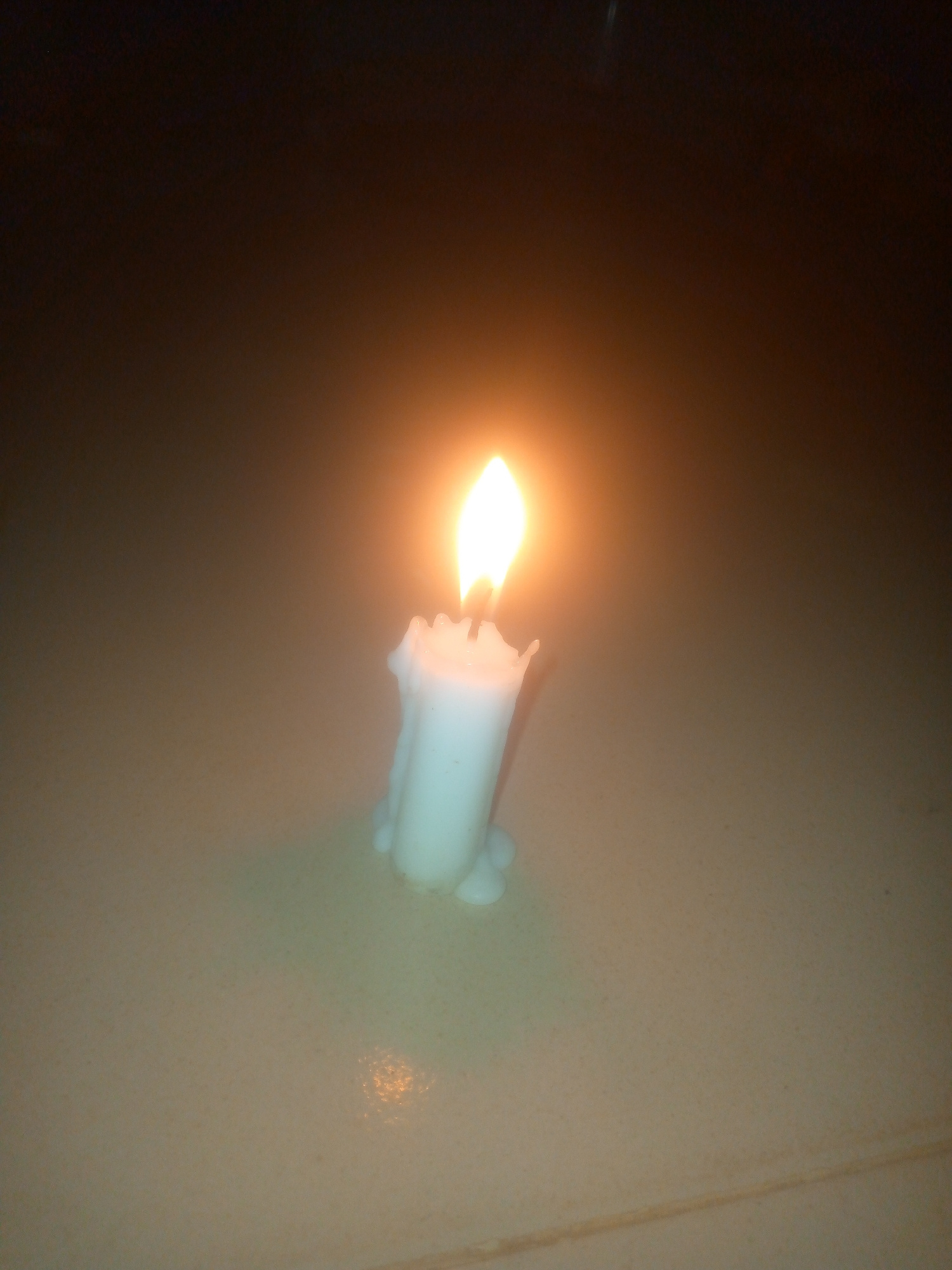 A lit, white wax candle sits on a tan tile surface in a darkened environment. The candle is partially melted, with wax drippings visible. The tile appears to have a reflective surface, mirroring the c…read more
