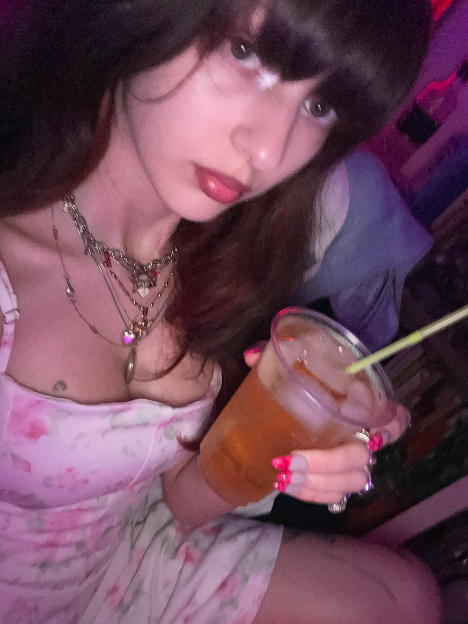 A young woman is indoors, holding a clear plastic cup with a yellow straw and a beverage inside, possibly iced tea. She is wearing a floral-patterned dress and several necklaces. She has dark hair andβ¦read more