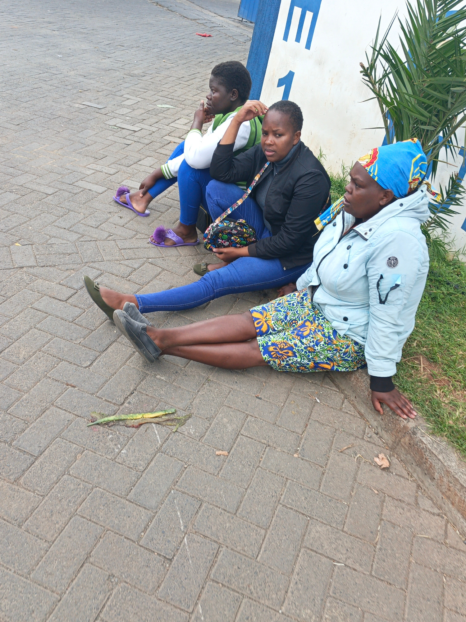 Three Black women are sitting on a brick-paved sidewalk near a wall. The woman furthest to the left wears a white and green jacket, blue jeans, and purple sandals. The woman in the middle wears a blac…read more