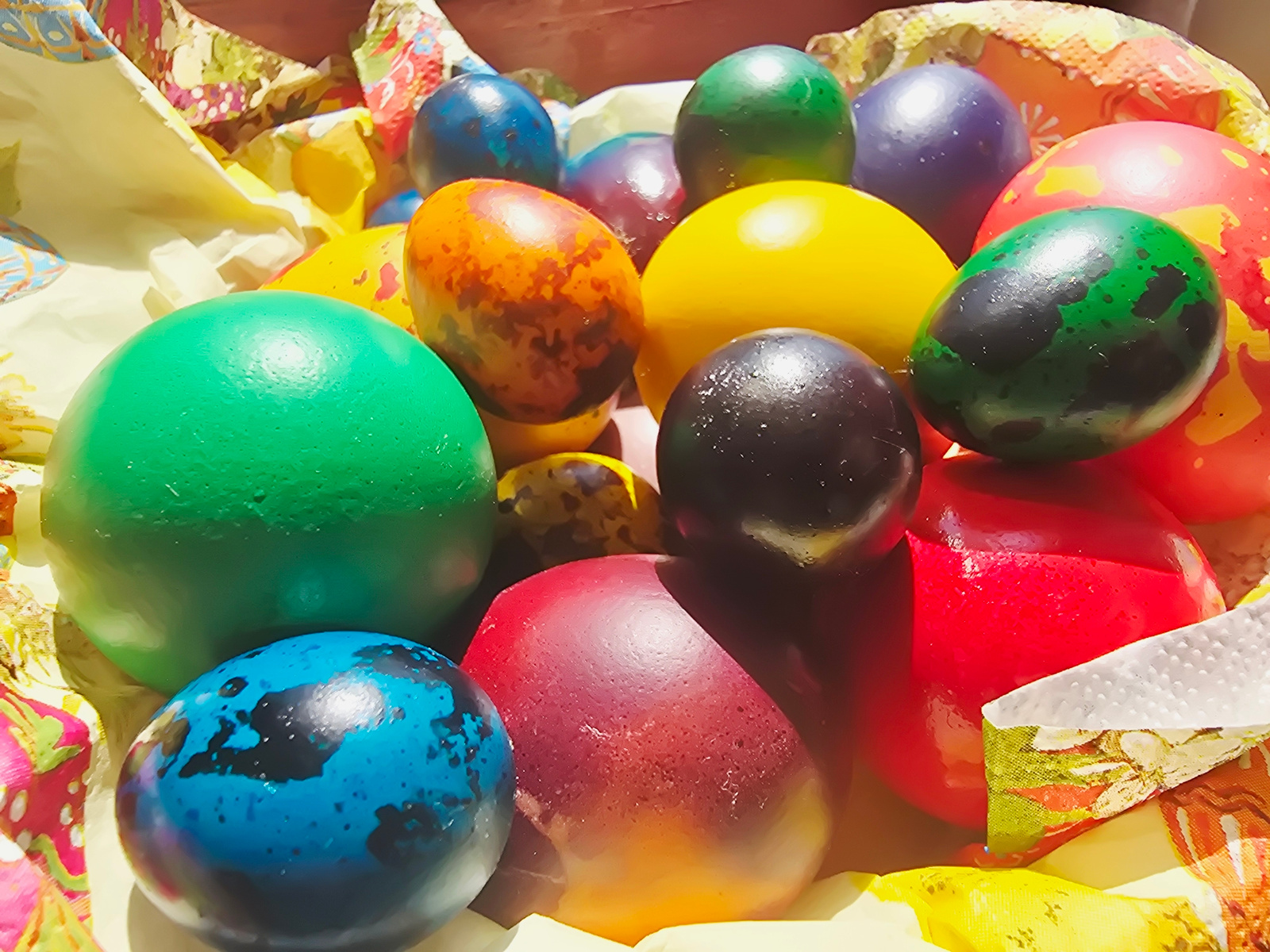 A close-up image shows a colorful assortment of Easter eggs nestled in a basket lined with patterned fabric. The eggs are various colors, including green, blue, orange, yellow, purple, black, and red,…read more