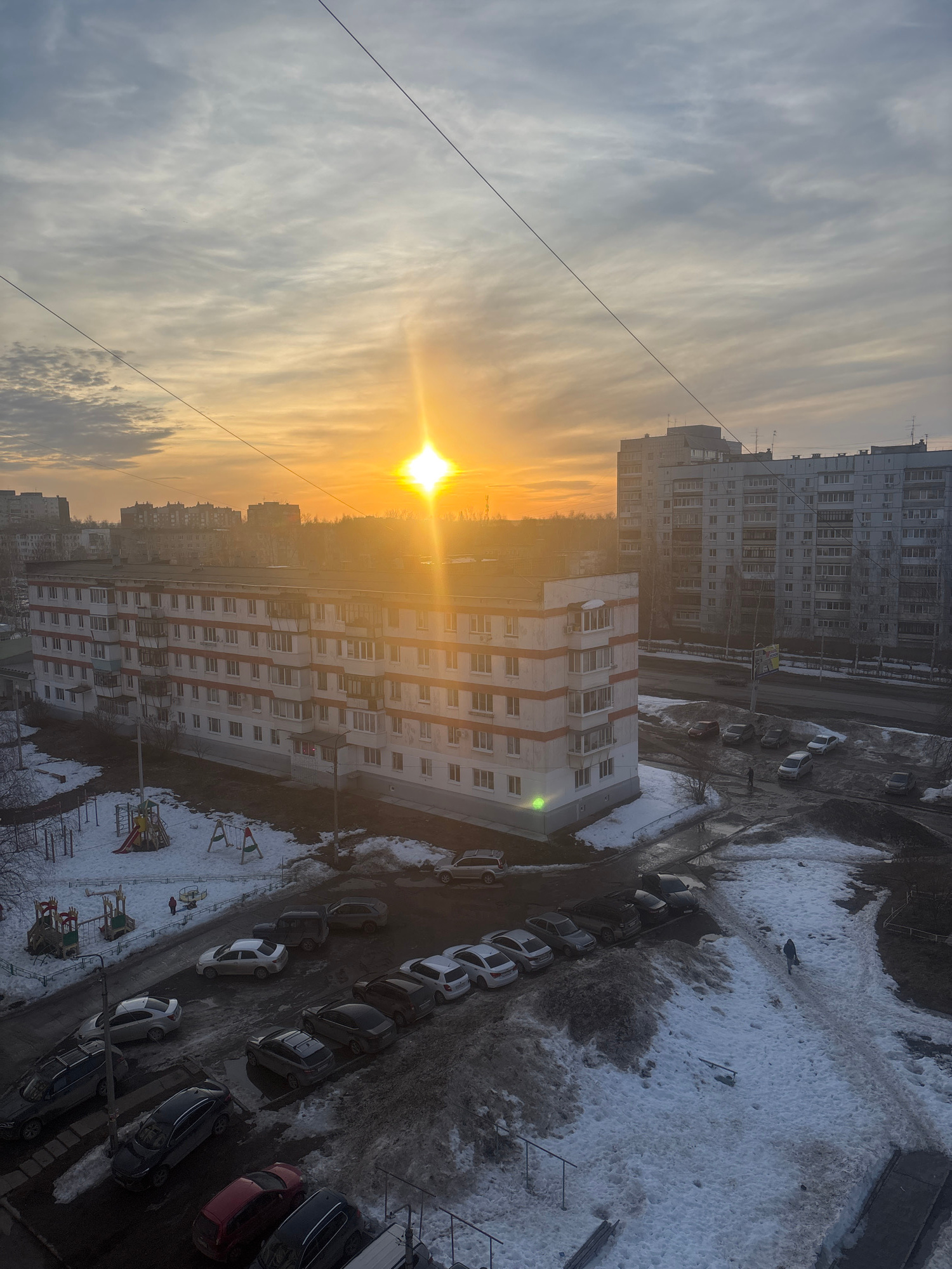 An elevated, outward-looking view captures a residential area in Chaikovsky, Russia, during what appears to be late winter or early spring at sunrise or sunset. The sun, a bright orb, is positioned in…read more