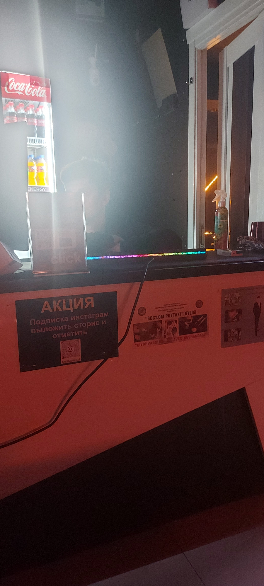 The image shows a Coca-Cola fridge, possibly in a store, with various promotional materials attached to the side. A "click" advertisement is visible on the fridge door. A sign in Russian advertises a…read more