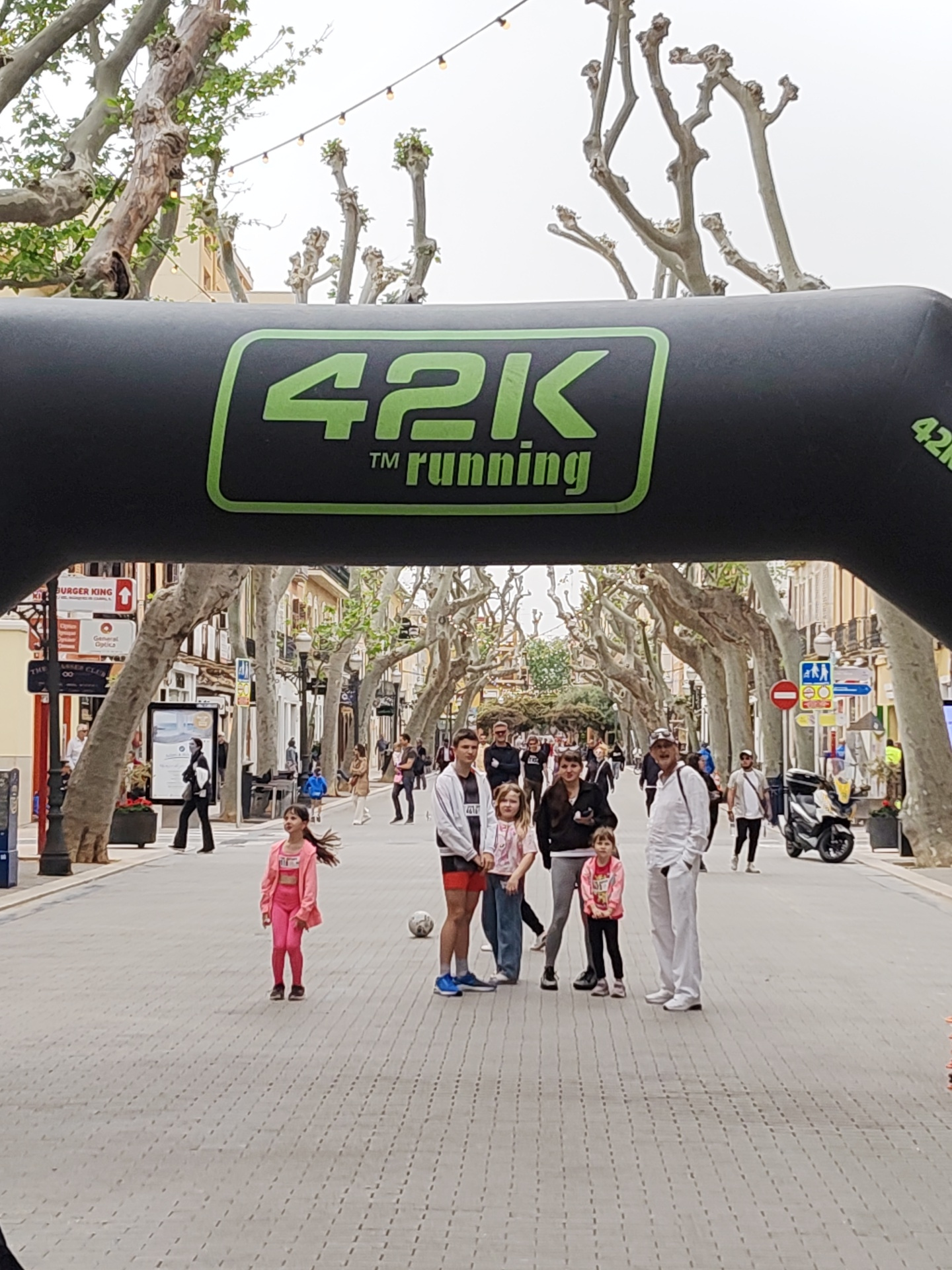 The image depicts a street scene in Dénia, Spain, taken from under a black inflatable archway with the words "42K Running" displayed in green. The street is lined with trees, creating a canopy effect.…read more