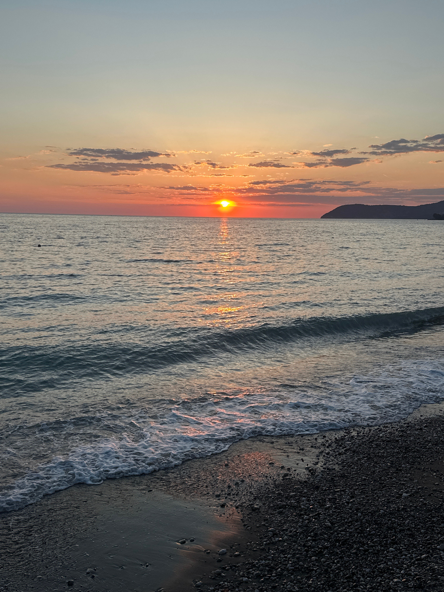 The image shows a sunset over the Adriatic Sea in Šušanj, Montenegro. The sun is setting on the left side of the frame, casting an orange glow on the sky and water. The sea is calm, with small waves w…read more