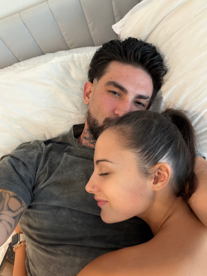 An overhead photograph captures two individuals, an adult male and an adult female, in a close embrace while lying in a bed. This scene is situated within a bedroom in Bangkok, Thailand. The male, po…read more
