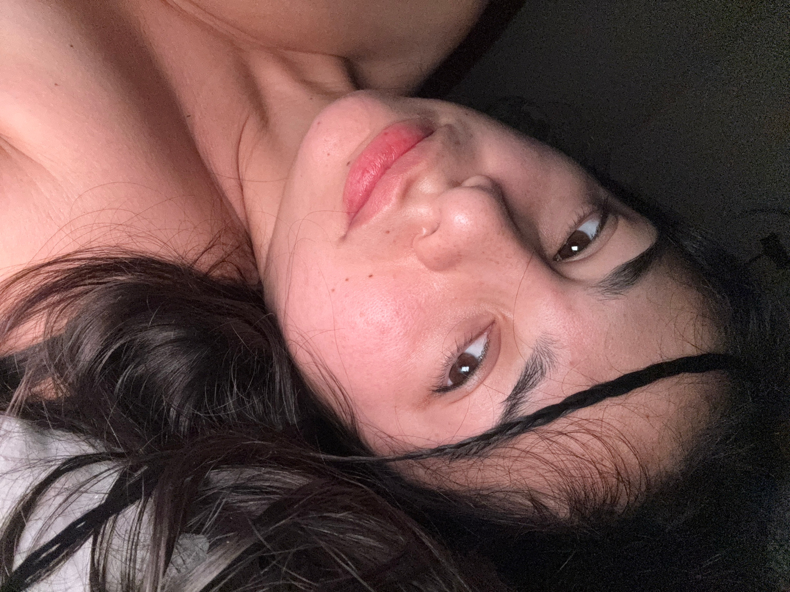 A close-up, selfie-style photograph features a young woman with dark brown hair and light brown eyes. A single, thin braid is visible across her forehead. Her skin is fair with a light pink undertone,…read more