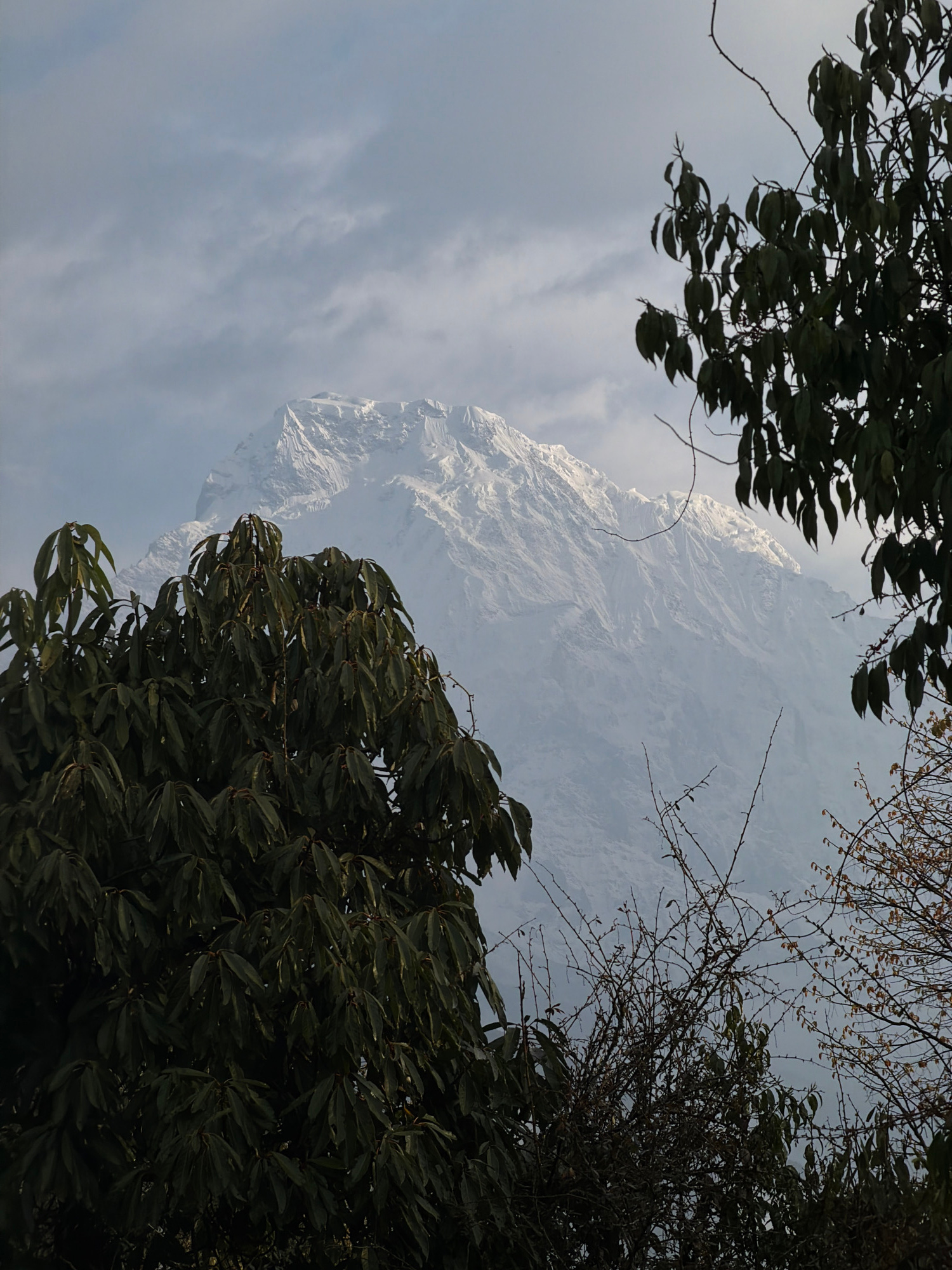 The scene, located in Purano Ghandruk, Nepal, displays a large, snow-capped mountain range under a cloudy, light grey sky. A prominent, rugged white peak dominates the central and upper background, it…read more