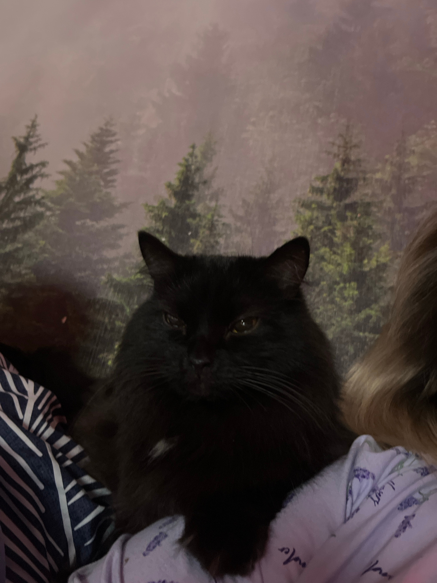 A black cat with long fur is the primary subject of this indoor image. The cat is positioned at an angle, with its head facing towards the camera. To the cat's right is a person, partially visible wit…read more