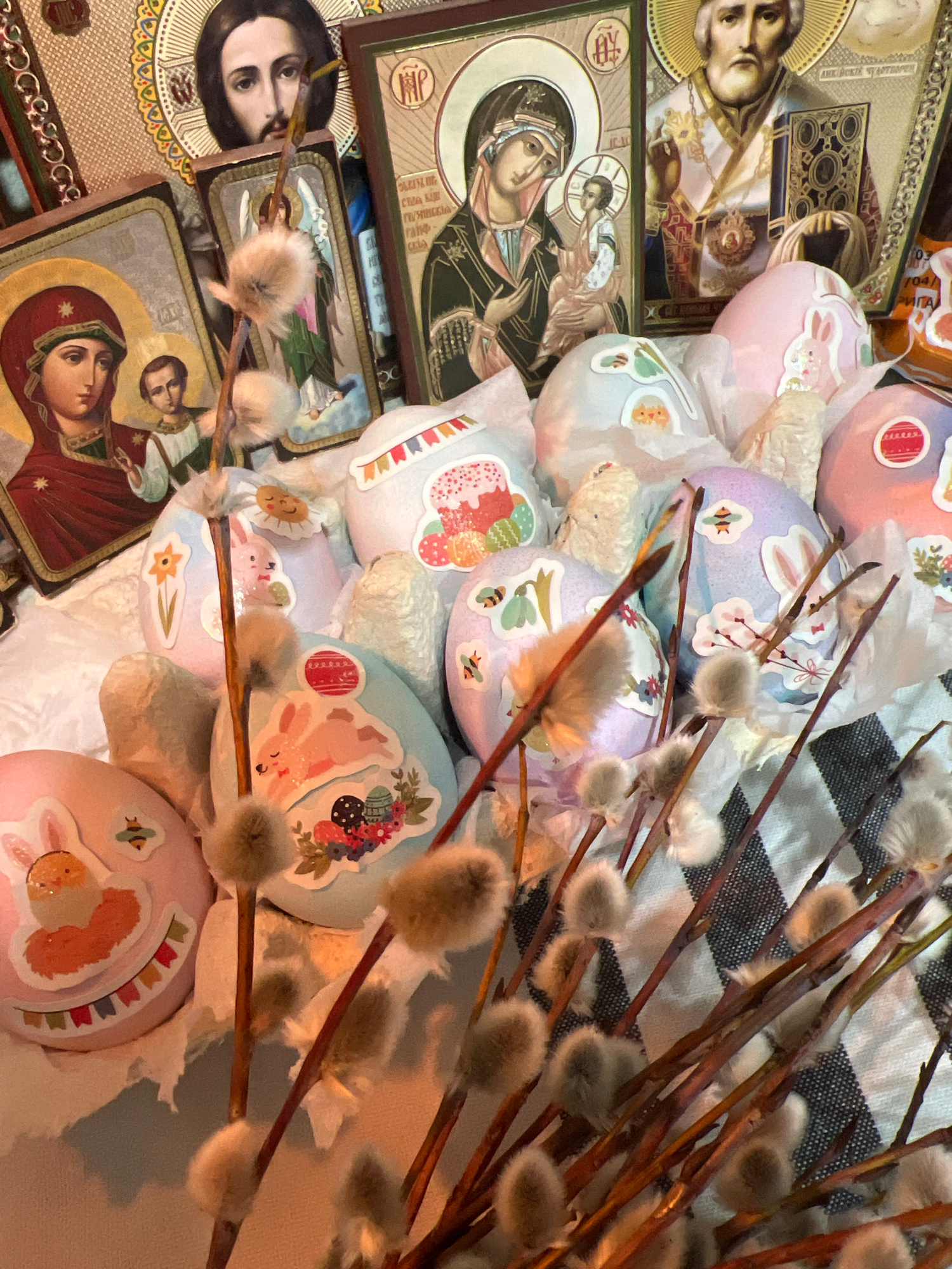 The image shows a still life scene composed of Orthodox icons, Easter eggs, and pussy willow branches. The icons, depicting religious figures, are arranged on the left side of the frame. The Easter eg…read more