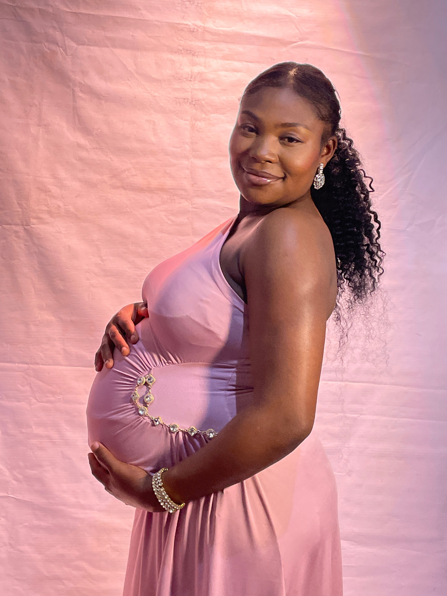 A pregnant woman with dark skin and curly black hair is turned sideways in a photo against a pink backdrop. She is wearing a pink dress, a bracelet on her right wrist, and earrings. She is holding her…read more