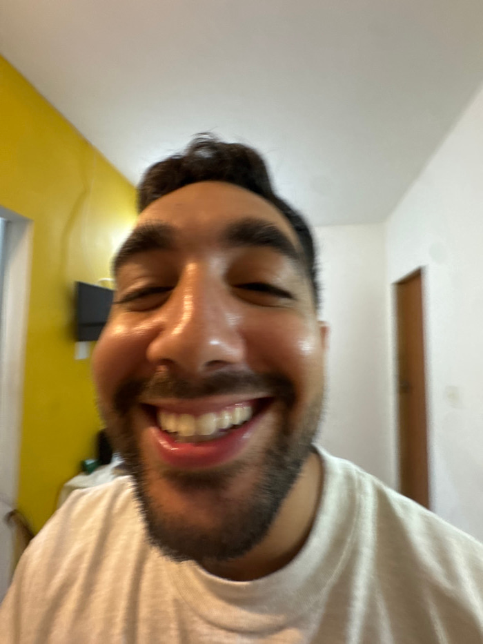 A smiling man, likely taking a selfie, is prominently featured. He has dark hair and a beard. His face is well-lit, showing a slight sheen of sweat. The background consists of a white wall at the top,…read more