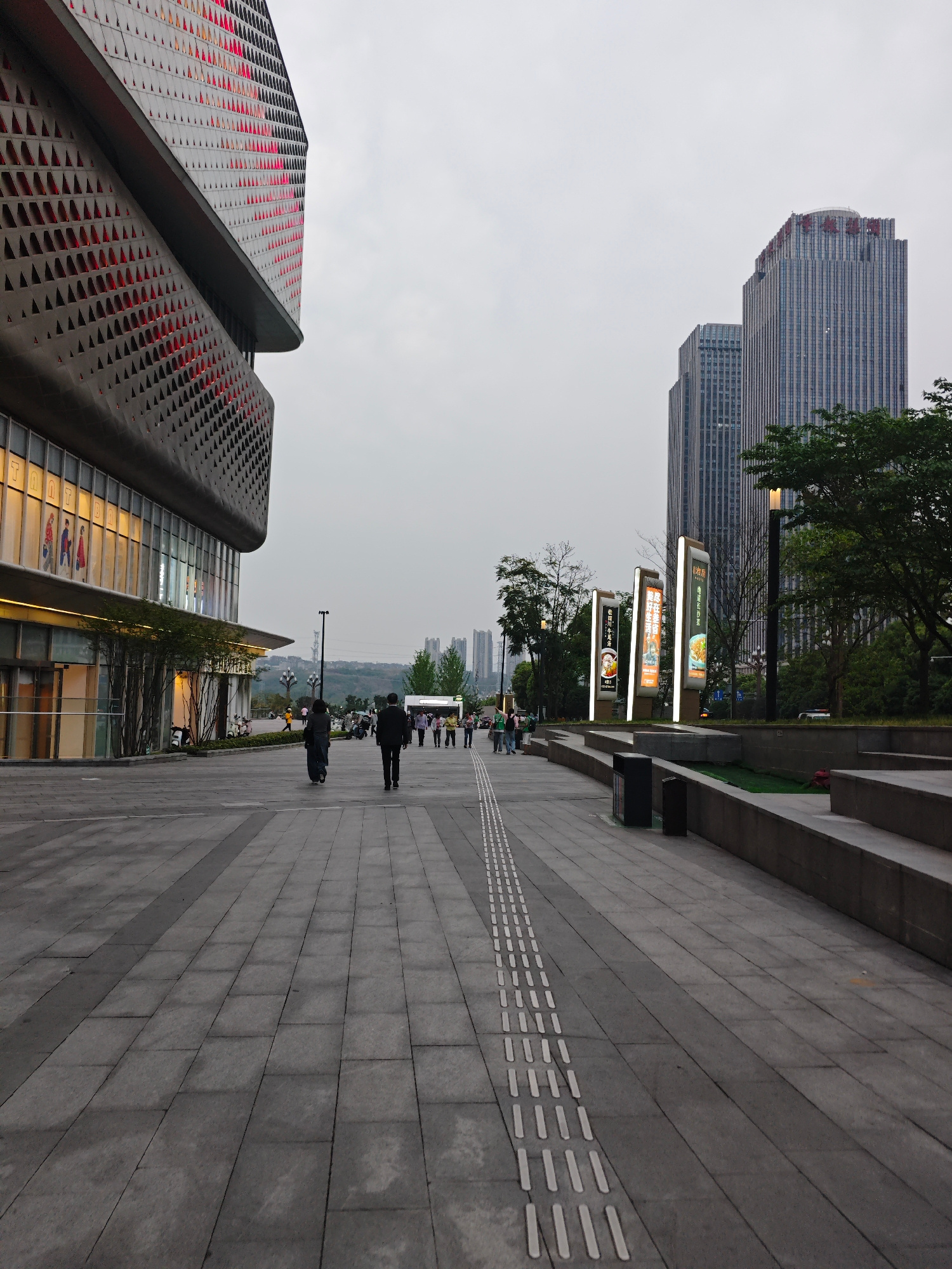 The image shows a street scene in the Liangjiang New Area, Chongqing, China. A paved walkway with tactile paving for the visually impaired stretches into the distance. On the left is a large, modern b…read more