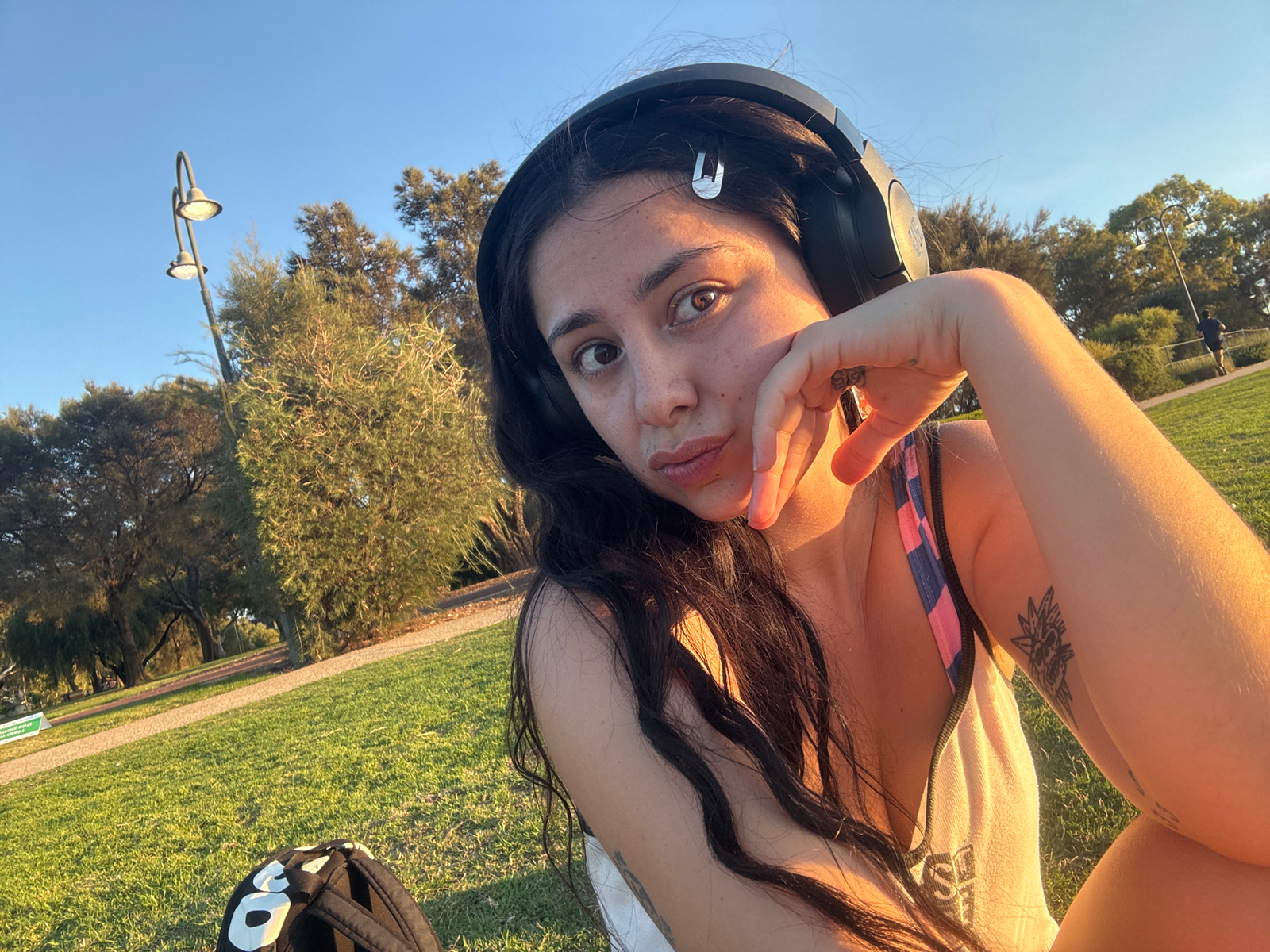 A medium-shot selfie photograph shows a young woman sitting on a grass area. She wears large, black over-ear headphones and a silver clip in her dark, wavy hair. She has fair skin and is wearing a lig…read more