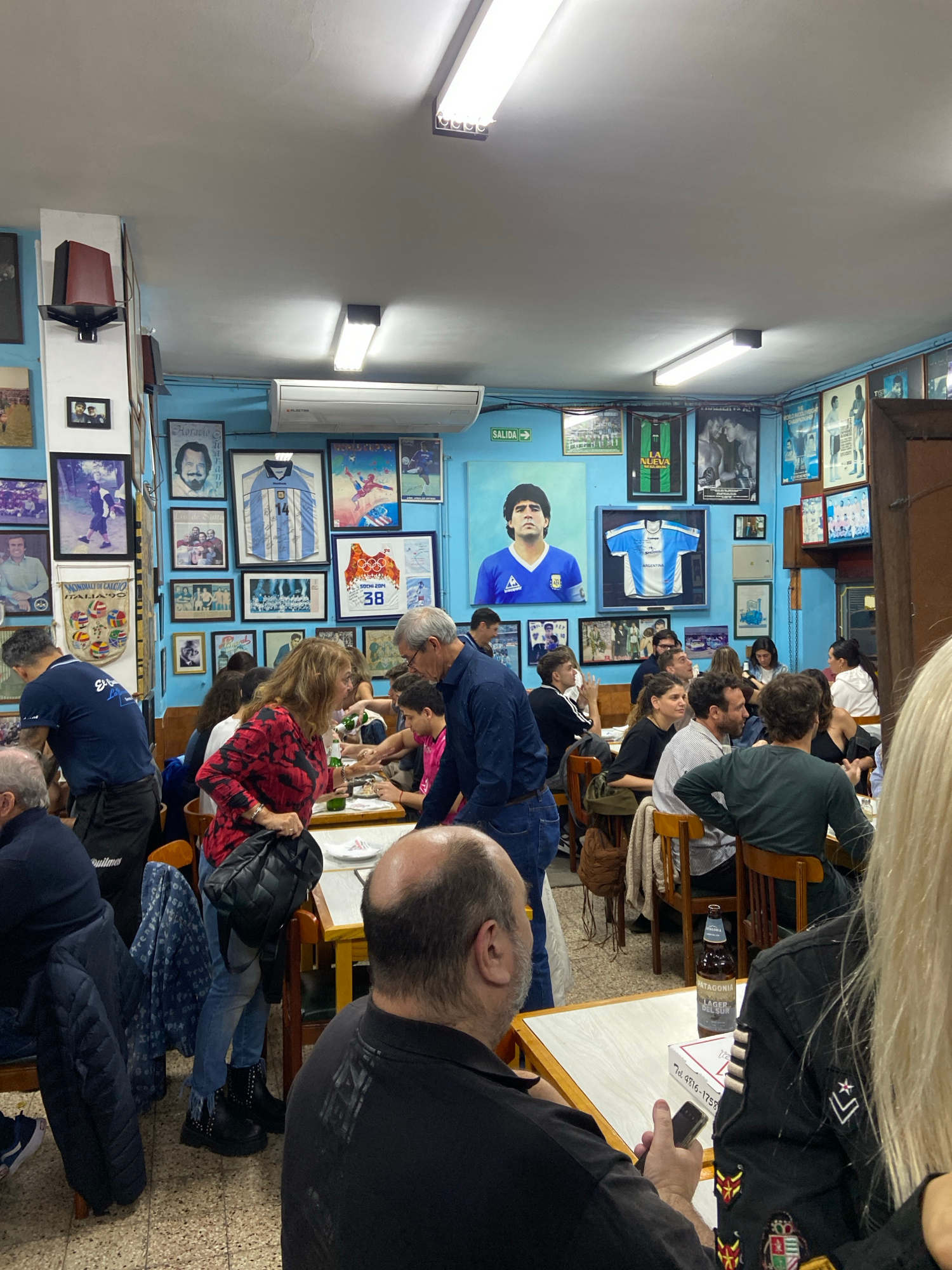 The interior of a restaurant or bar in Buenos Aires, Argentina, is filled with customers seated at tables. The walls are covered with framed images, posters, and memorabilia related to Diego Maradona…read more