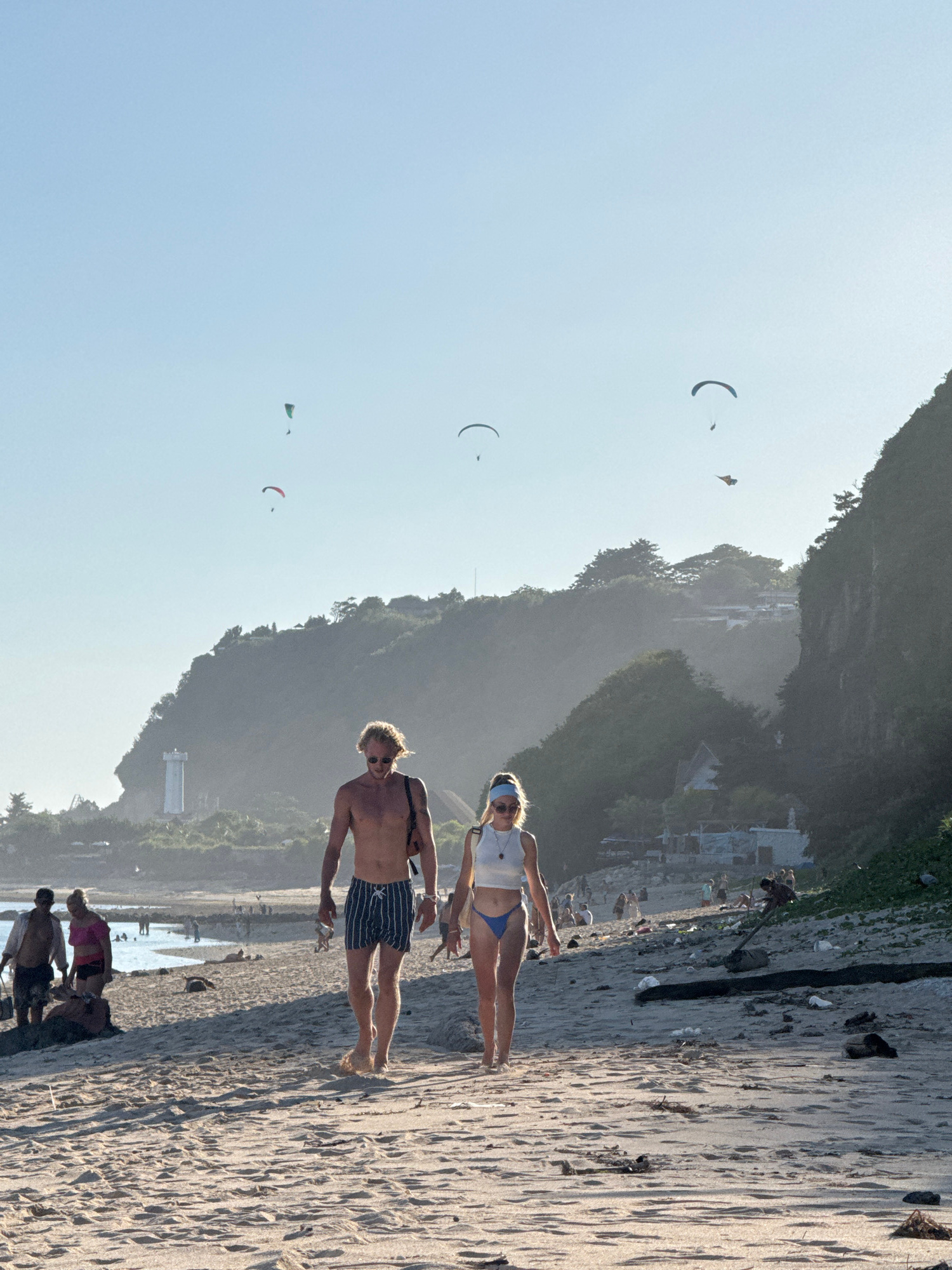 The image depicts a beach scene in Kuta Selatan, Indonesia. Two people, a man and a woman, are walking on the sandy beach. The man is shirtless, wearing striped swimming trunks, and is fair-skinned. T…read more