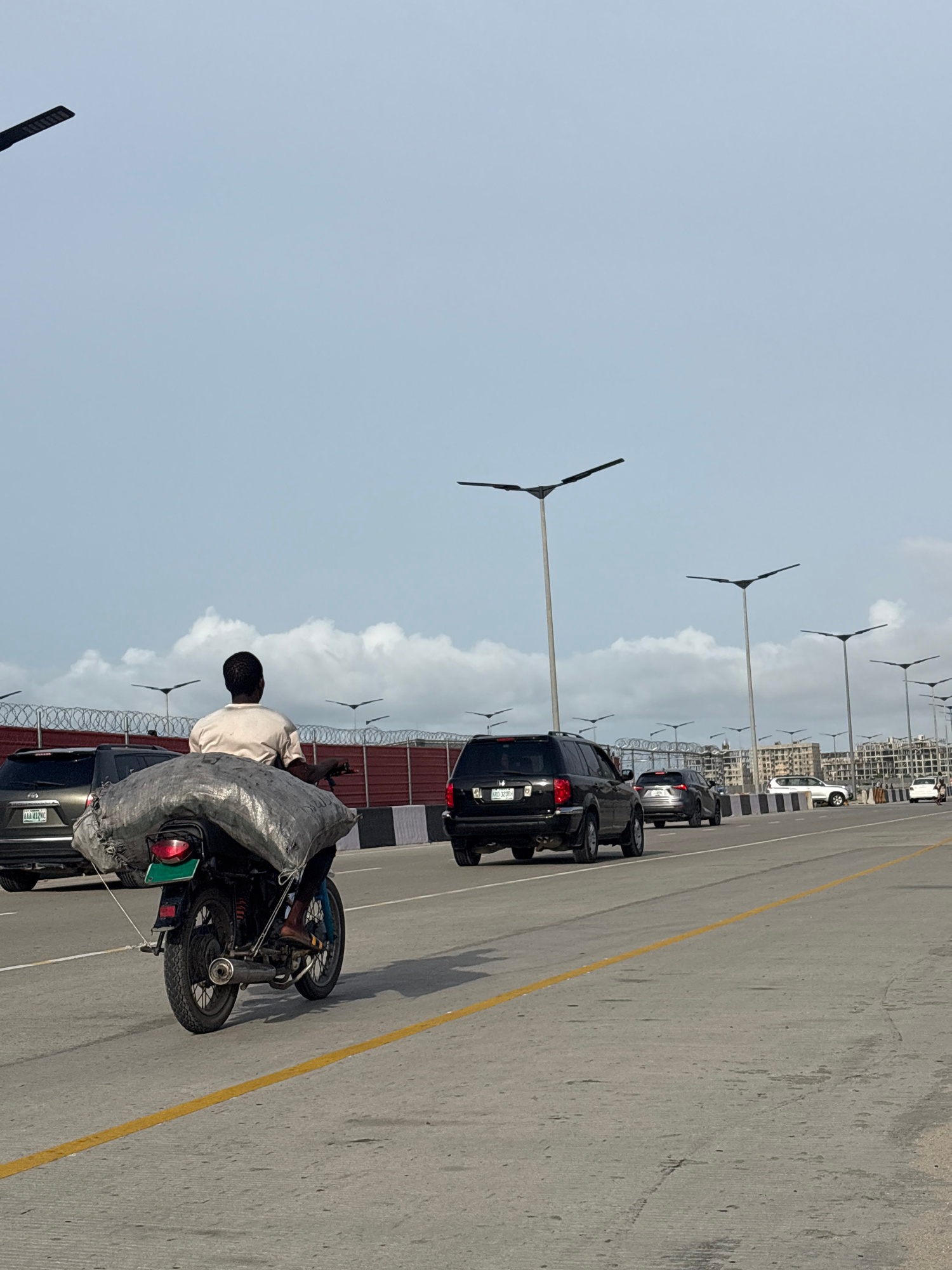 The image shows a view of a roadway in Alaguntan, Nigeria. In the foreground, a man is sitting on a motorcycle. The motorcycle has a large load covered in a grey tarp strapped to the back. The man isβ¦read more