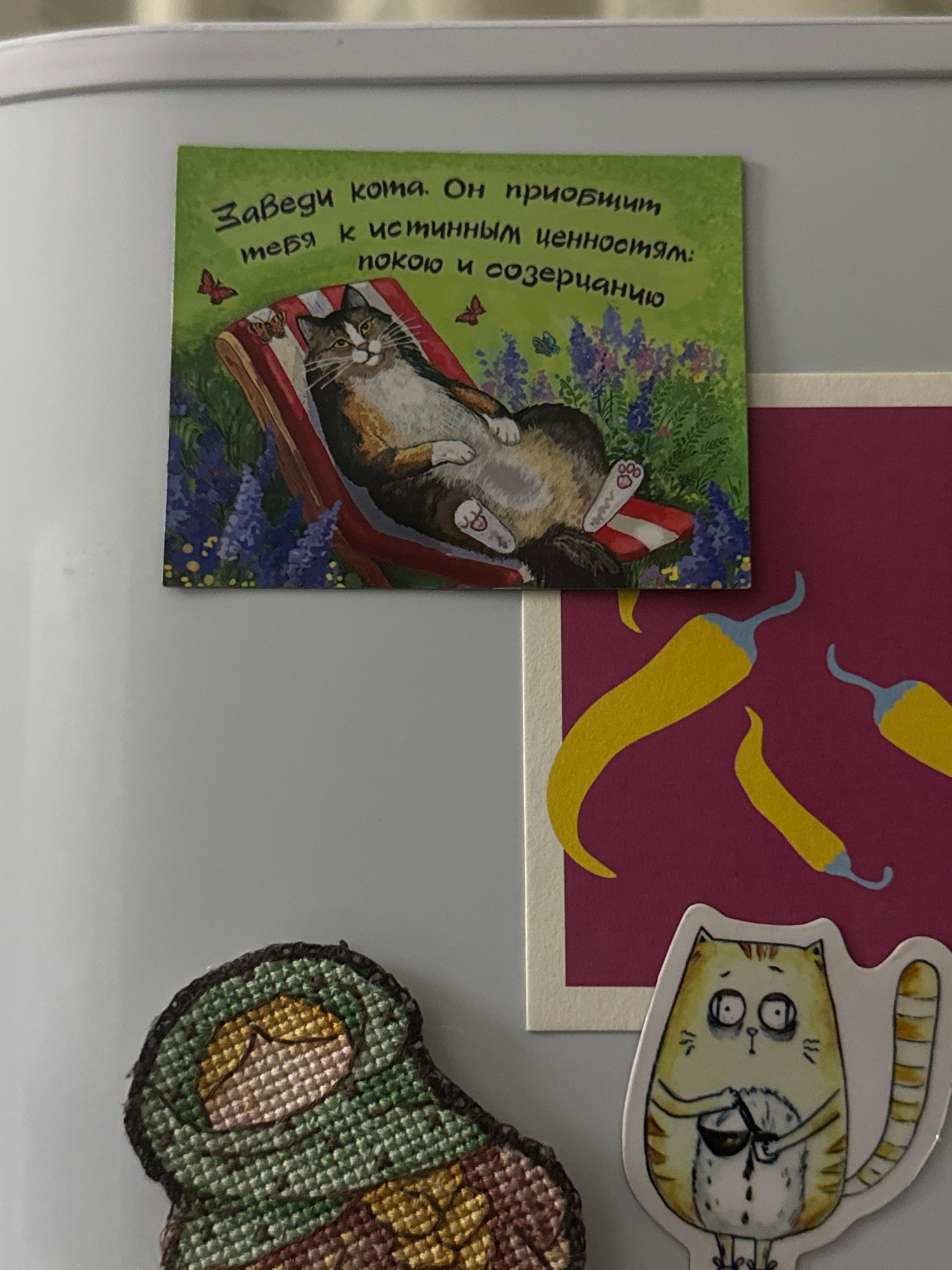 The image shows a collection of items attached to a refrigerator. These items appear to be refrigerator magnets and/or stickers. They include a green postcard or magnet with an image of a cat lounging…read more