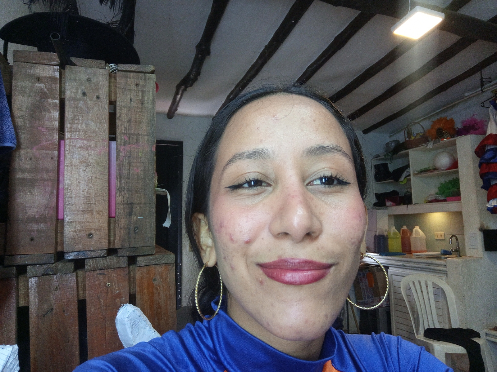 The image shows a woman with dark hair pulled back from her face, wearing large gold hoop earrings and a blue and orange shirt. She is smiling slightly, with noticeable skin imperfections. Behind her…read more