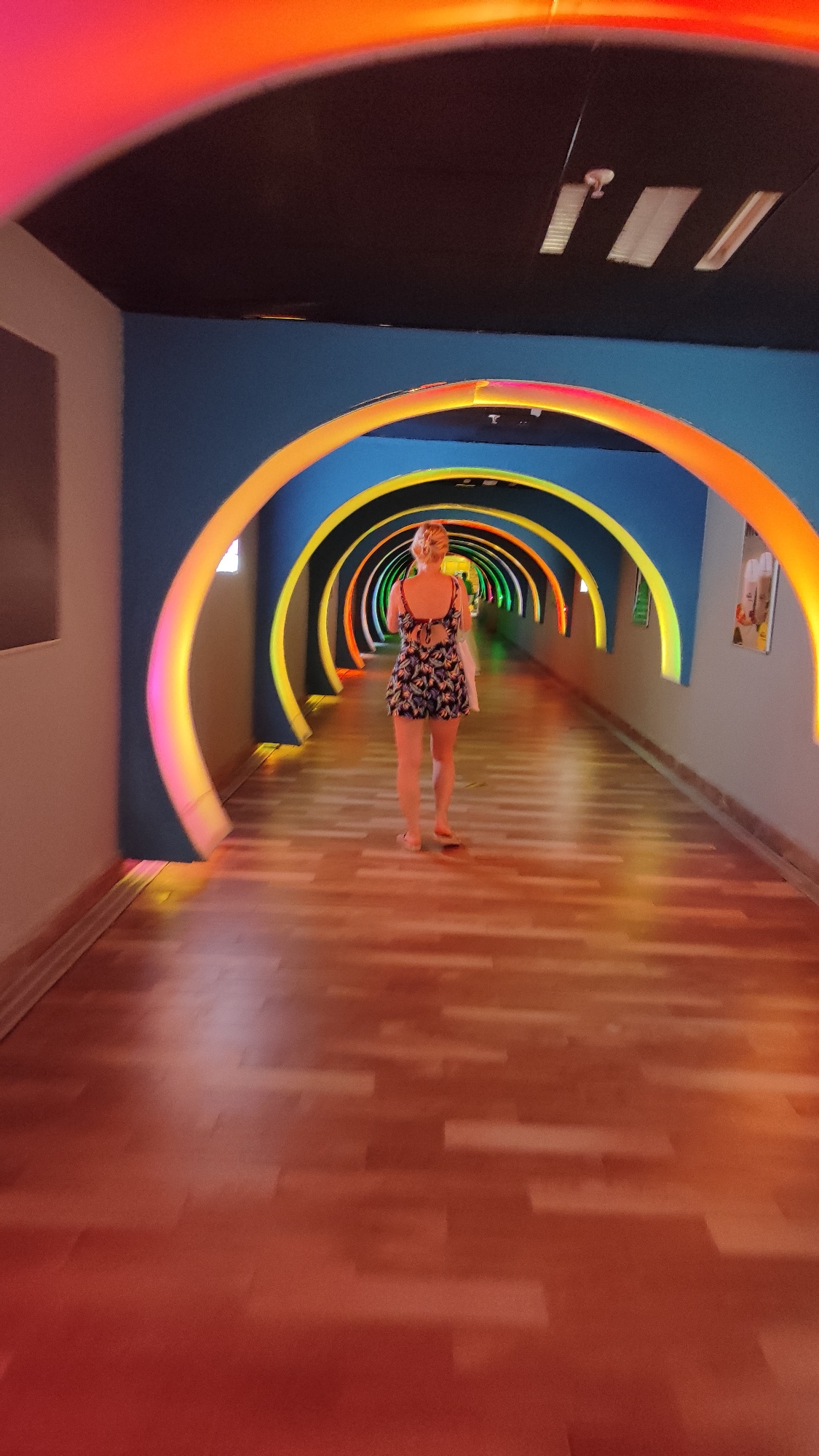 A woman is walking down a brightly lit corridor. The walls of the corridor are blue with a series of rainbow-colored arches overhead. The floor is made of wooden planks. The ceiling is dark and has th…read more