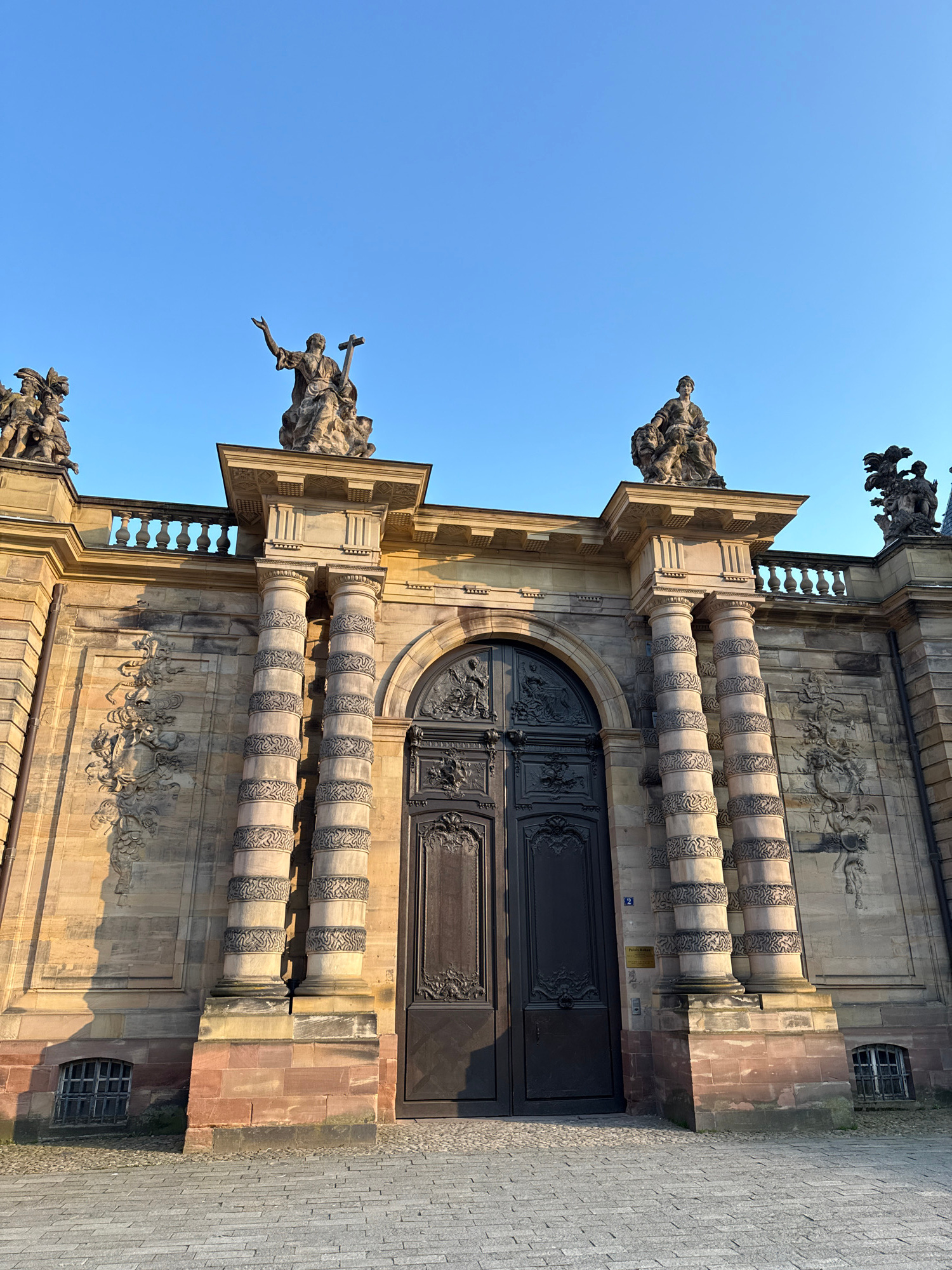 The image shows a partial view of the Saint-Pierre-le-Jeune Protestant church in Strasbourg, France. The focus is on a section of the facade featuring a large, ornate wooden door flanked by pairs of d…read more