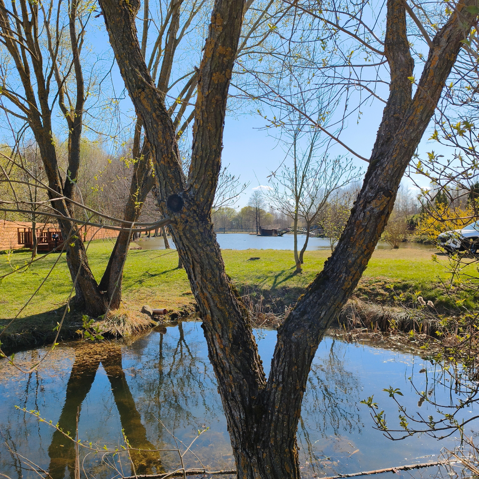 The image depicts a tranquil outdoor scene in Капцёўскі сельскі Савет, Belarus. A small body of water, possibly a pond or a stream, dominates the foreground, reflecting the sky and the surrounding trees. The water is calm, and some vegetation is visible at the edges. Several trees are present, both near the water's edge and further in the background. The trees in the foreground are bare or have sparse foliage, suggesting it is either early spring or late autumn. The bark of the trees is textured and has patches of yellow. In the background, there is a grassy area and additional trees, along with a small wooden structure that appears to be a deck or a platform extending over the water. A white vehicle is partially visible on the right side of the scene, parked near the grass. The sky is clear and blue. The overall impression is one of a serene and natural landscape. | Open Wire