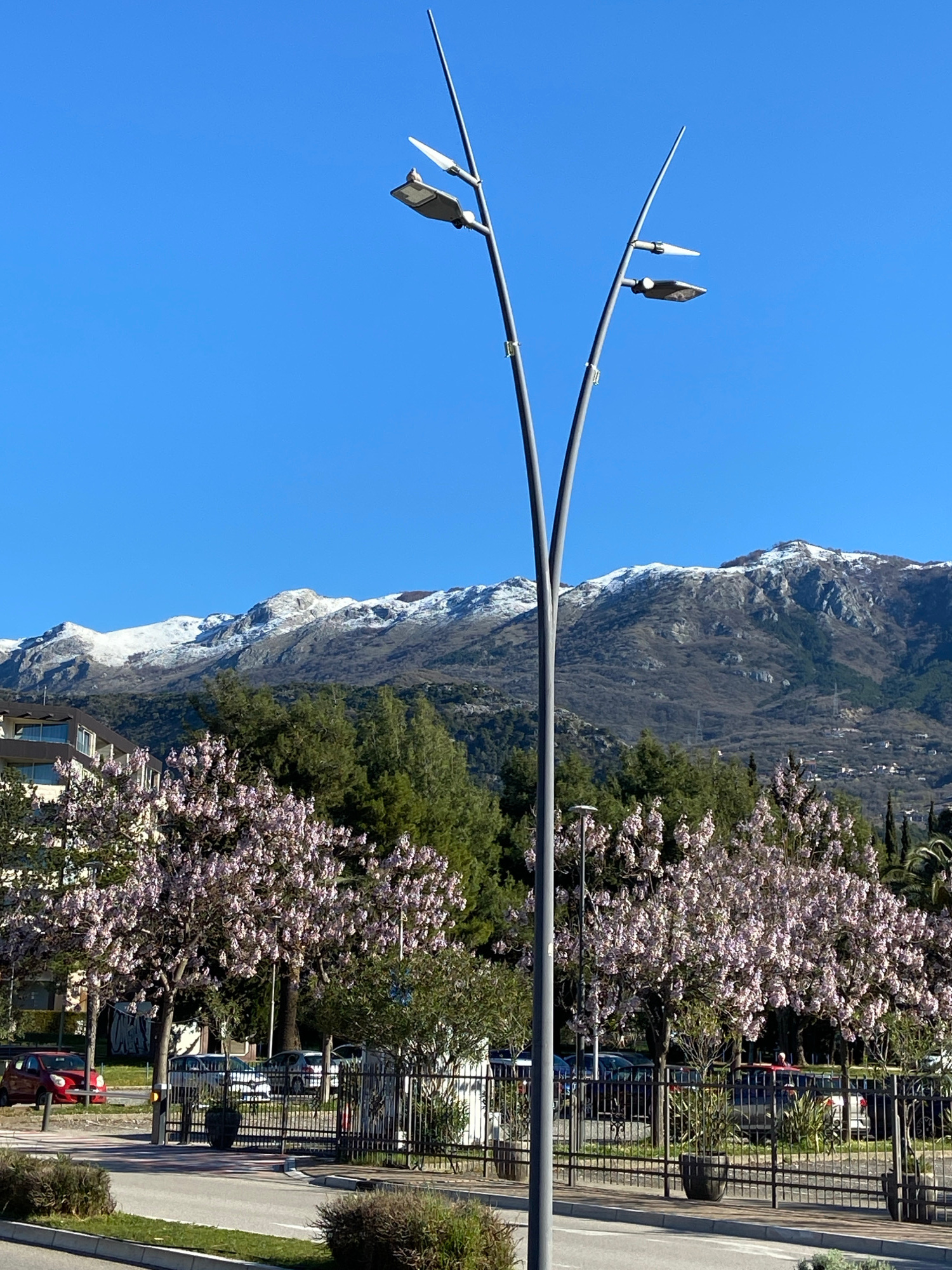 The image shows a street scene in Budva, Montenegro. A mountain range with snow-capped peaks is visible in the background. In the foreground, there is a street with blooming trees lining the sidewalk.…read more