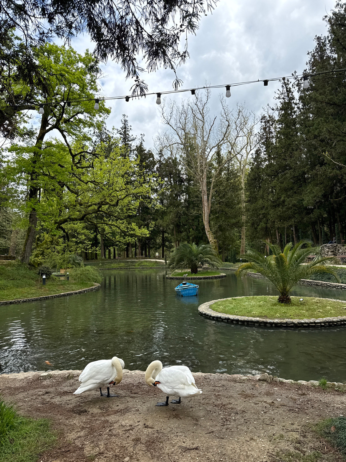 This image captures a tranquil park scene in Zugdidi, Georgia. A serene body of water, likely a canal or pond, winds through the center of the frame, its surface reflecting the overcast sky and surrou…read more