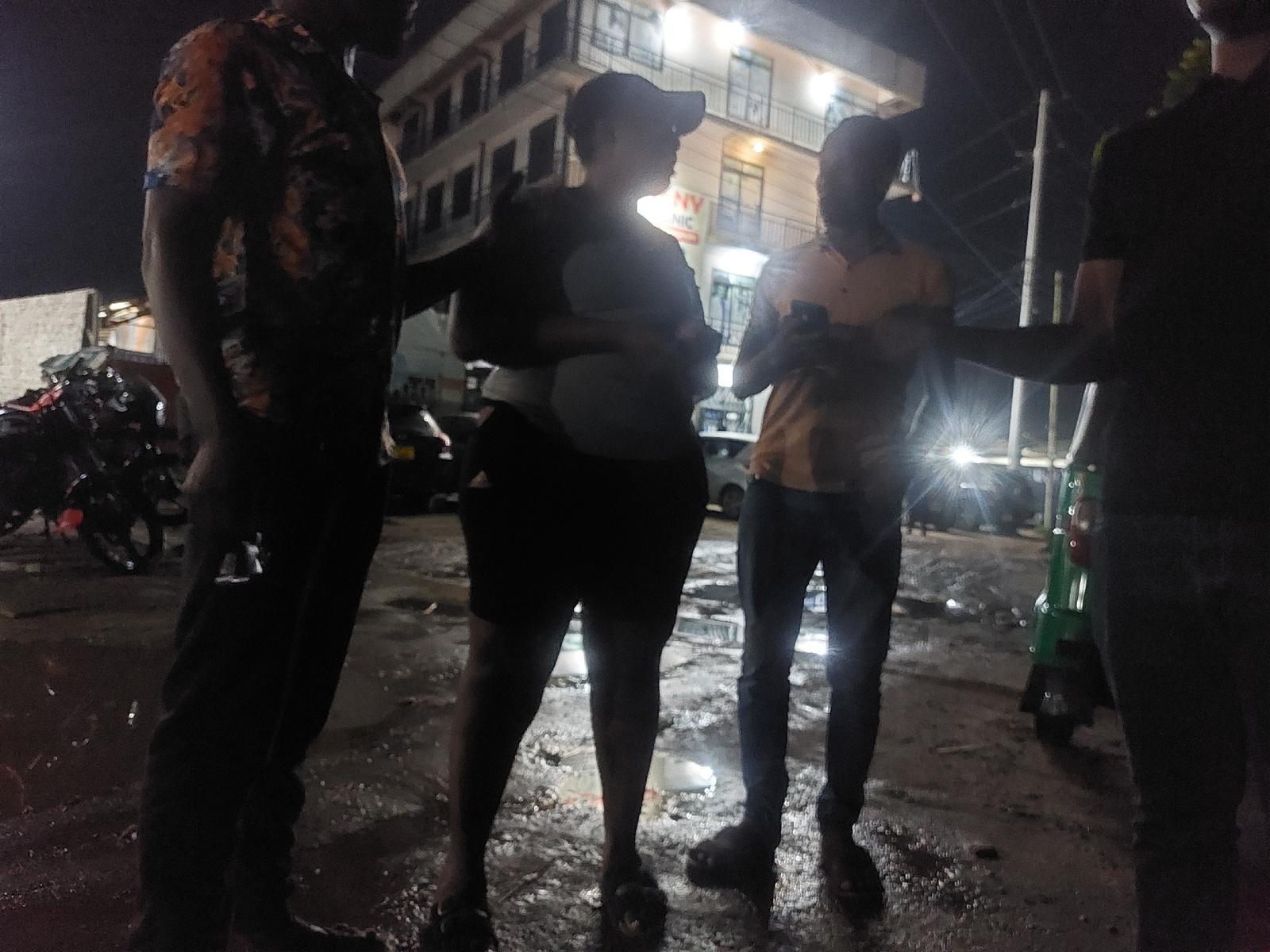 The image depicts a group of four people standing on a wet street at night. The first person, on the left, is wearing a patterned shirt and dark pants. The second person is wearing a baseball cap, a l…read more