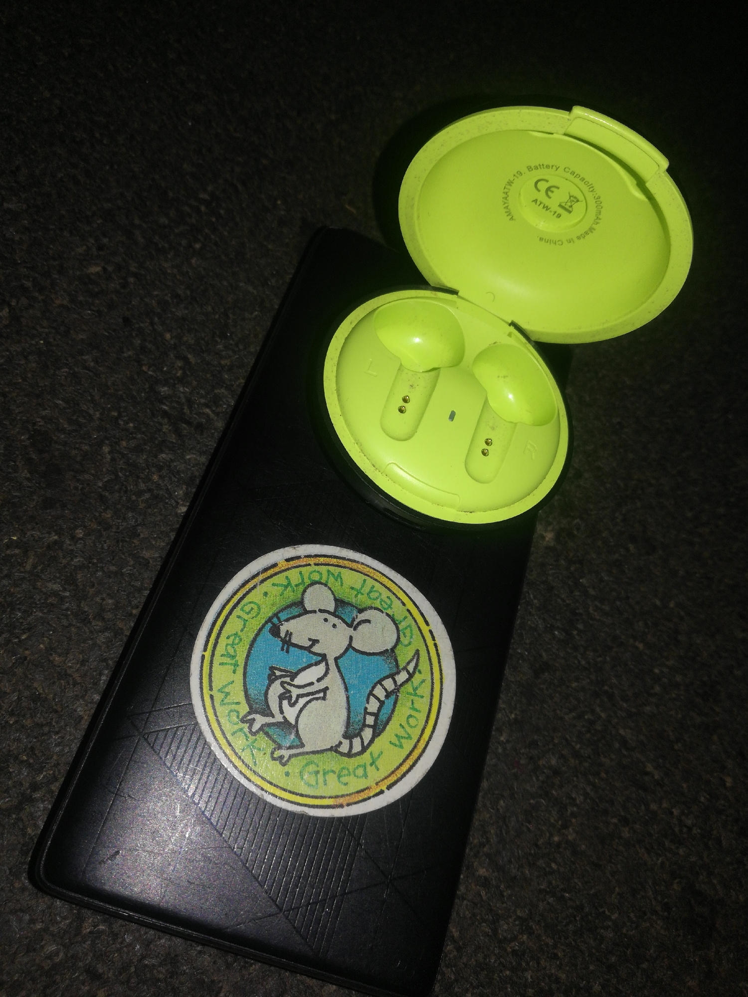 The image shows a black, rectangular object with a sticker depicting a cartoon mouse holding a book, surrounded by the words "Great Work" in a circular pattern. On top of the object is a pair of brigh…read more