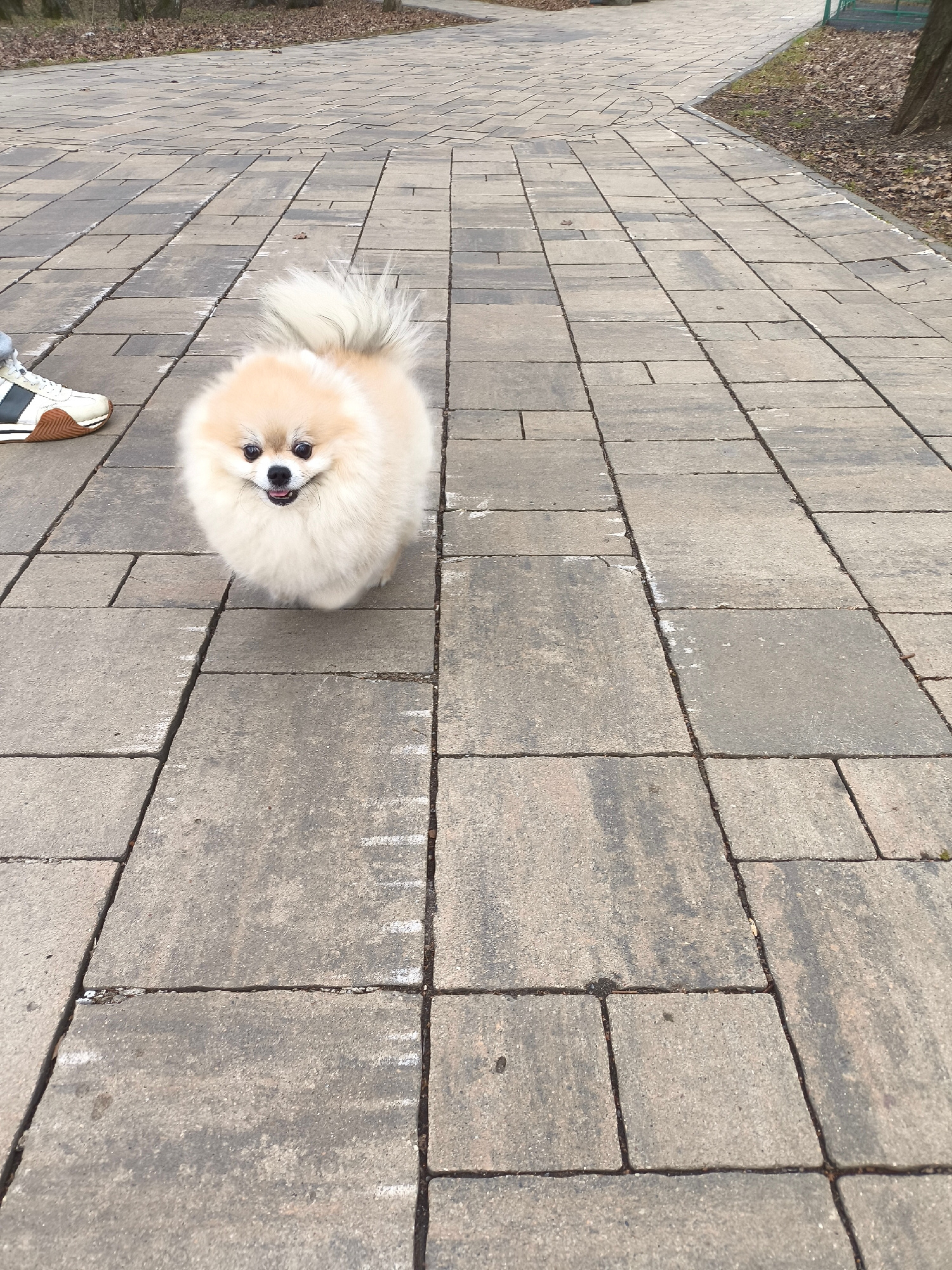 The image depicts a small, cream-colored Pomeranian dog standing on a paved walkway. The walkway is made of rectangular gray pavers with dark grout lines. A partial view of a person's shoe and lower l…read more