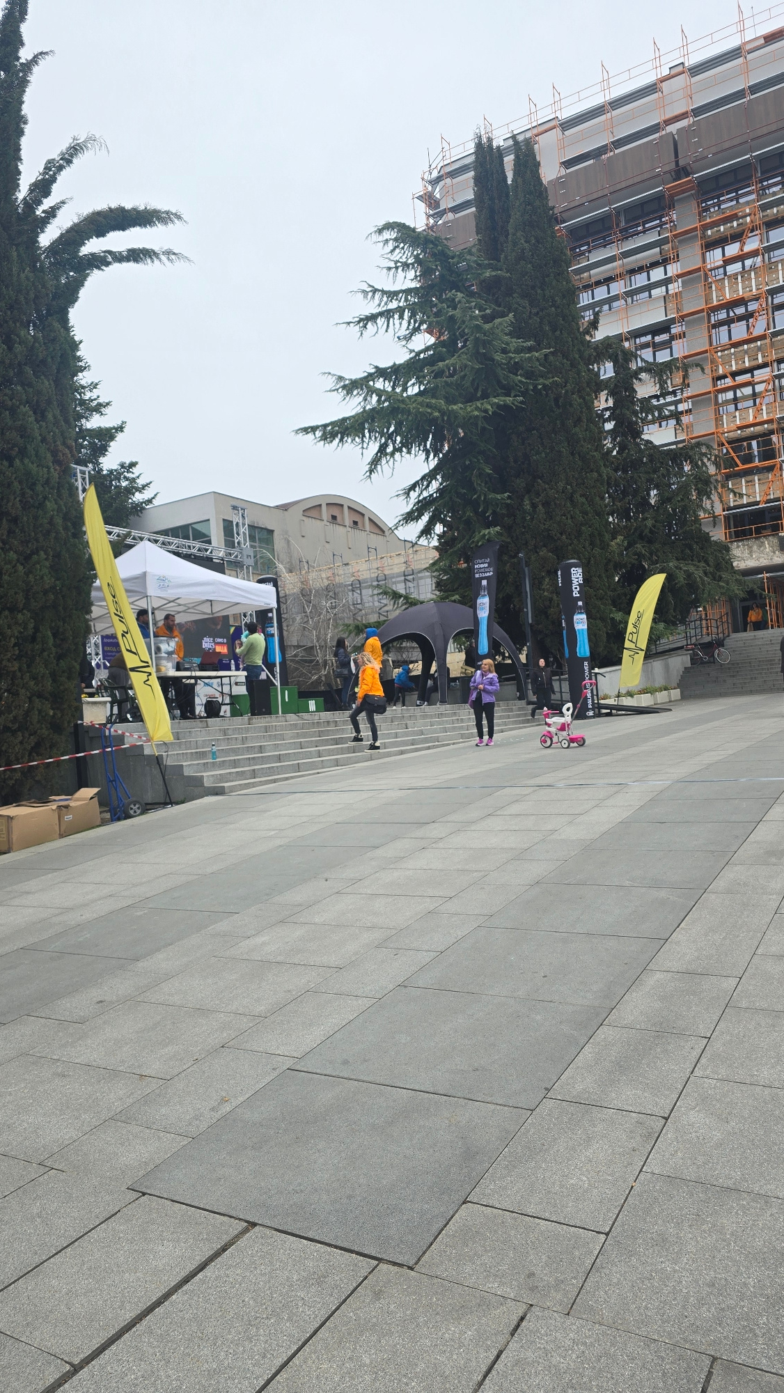 The image depicts an outdoor event taking place on a paved area in Stara Zagora, Bulgaria. A white tent is visible, suggesting a promotional or vendor space. People are observed walking and interacting around the tent and on the steps behind it. A large structure, possibly a building under construction or renovation, is partially visible in the background. Trees are present, and several yellow flags with the word "Pulse" on them are planted on the lawn. A black sculptural element is located in the background of the scene. Several promotional banners for "Powerade" are also visible. Several children are riding scooters. | Open Wire