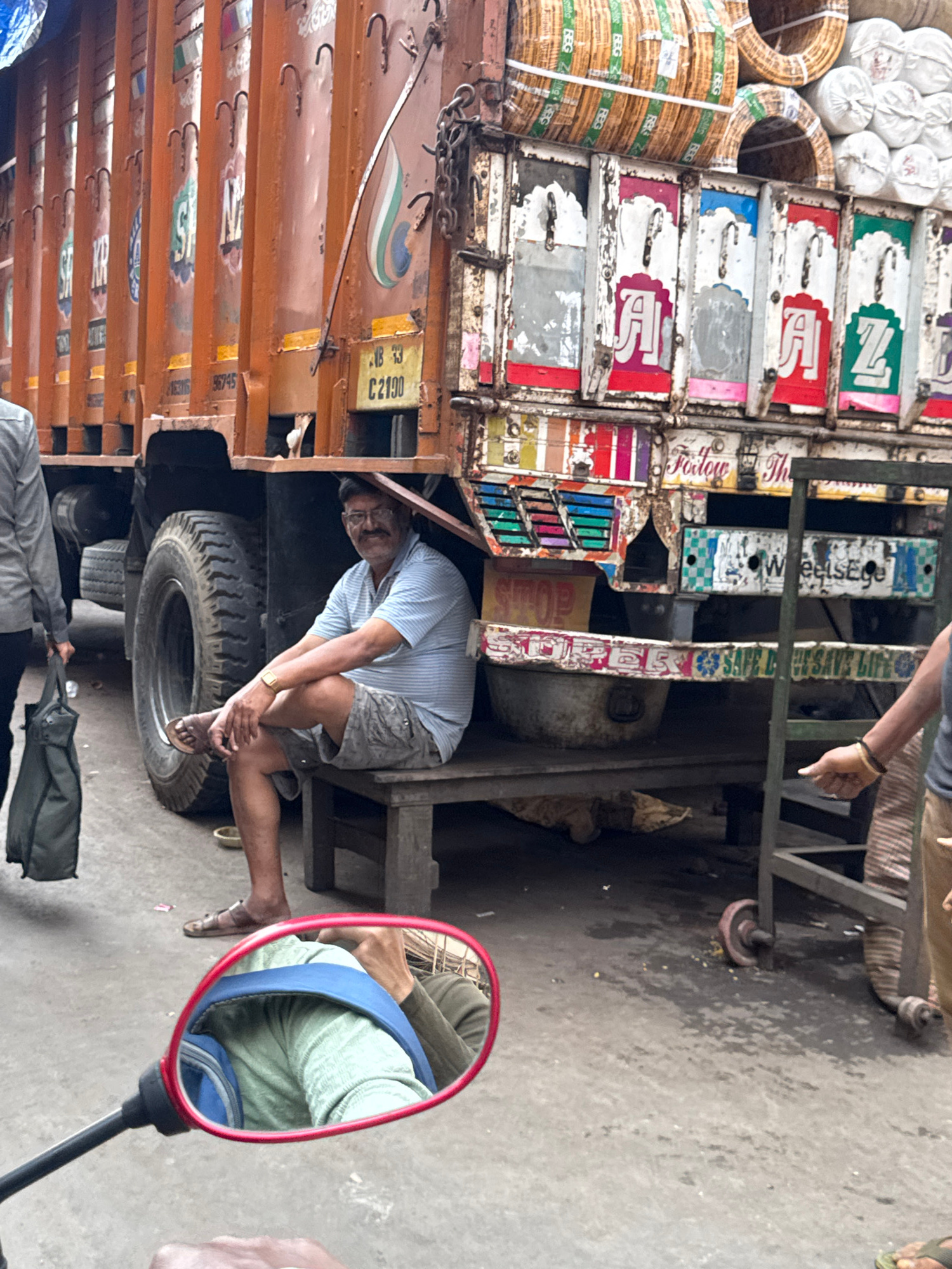 The image depicts a daytime street scene in a commercial area of Kolkata, West Bengal, India. The location is confirmed by a "WB 33 C2190" license plate visible on the side of a large, weathered orang…read more