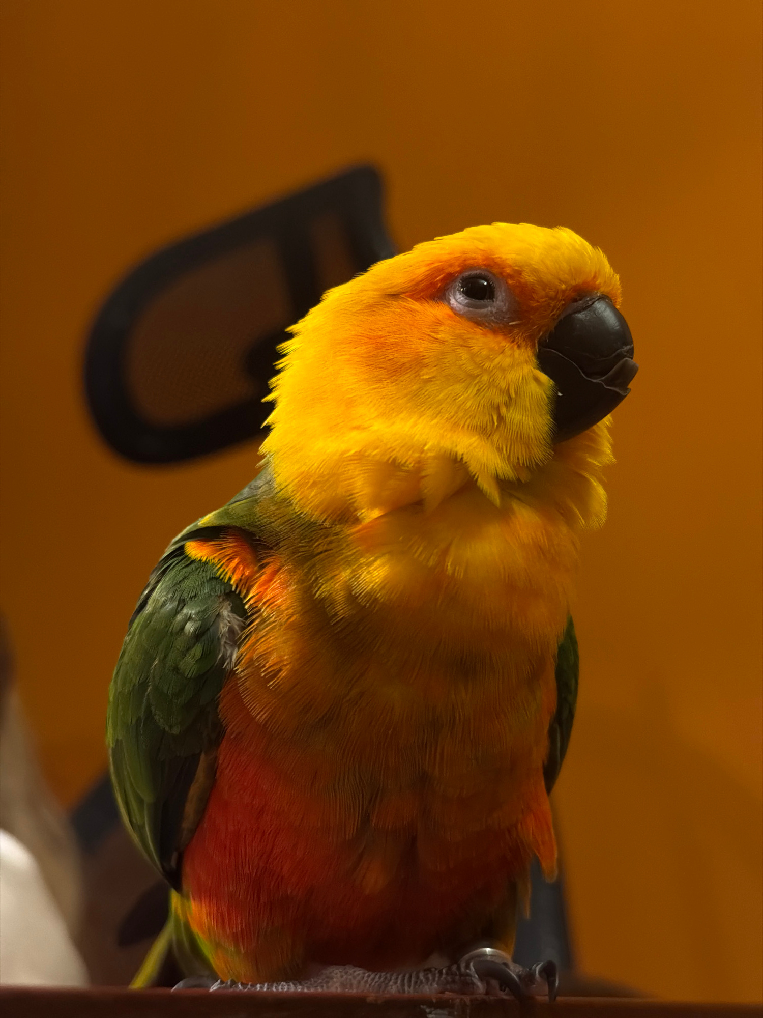 A brightly colored Sun Conure parrot perches on a branch. The bird exhibits yellow plumage on its head and chest, transitioning to orange and green towards its wings and tail. It has a black beak and…read more