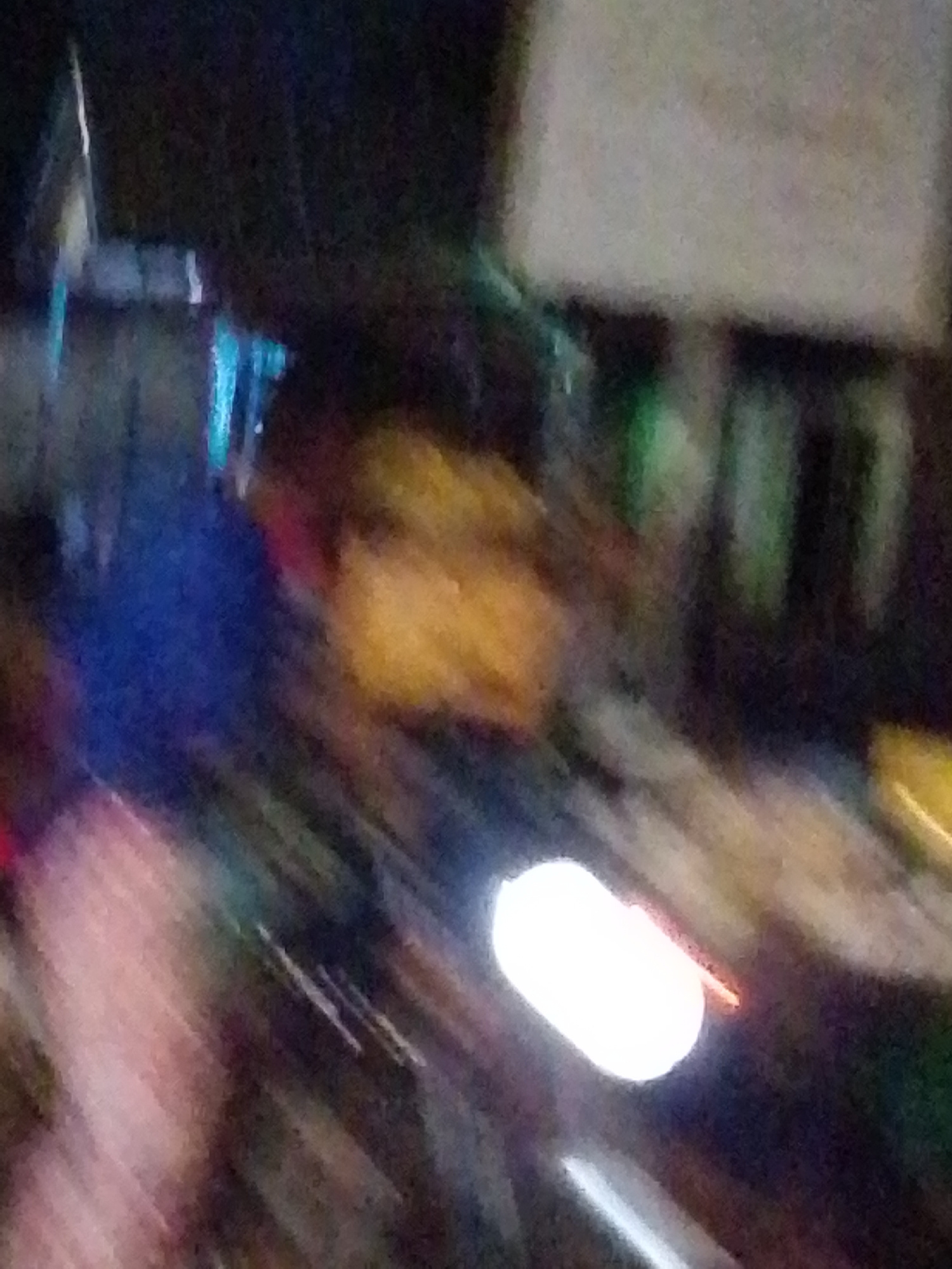 A blurry, low-quality image taken at night in what appears to be an urban environment. In the foreground, there is a bright, white object that may be a light source, possibly a vehicle headlight. Behi…read more
