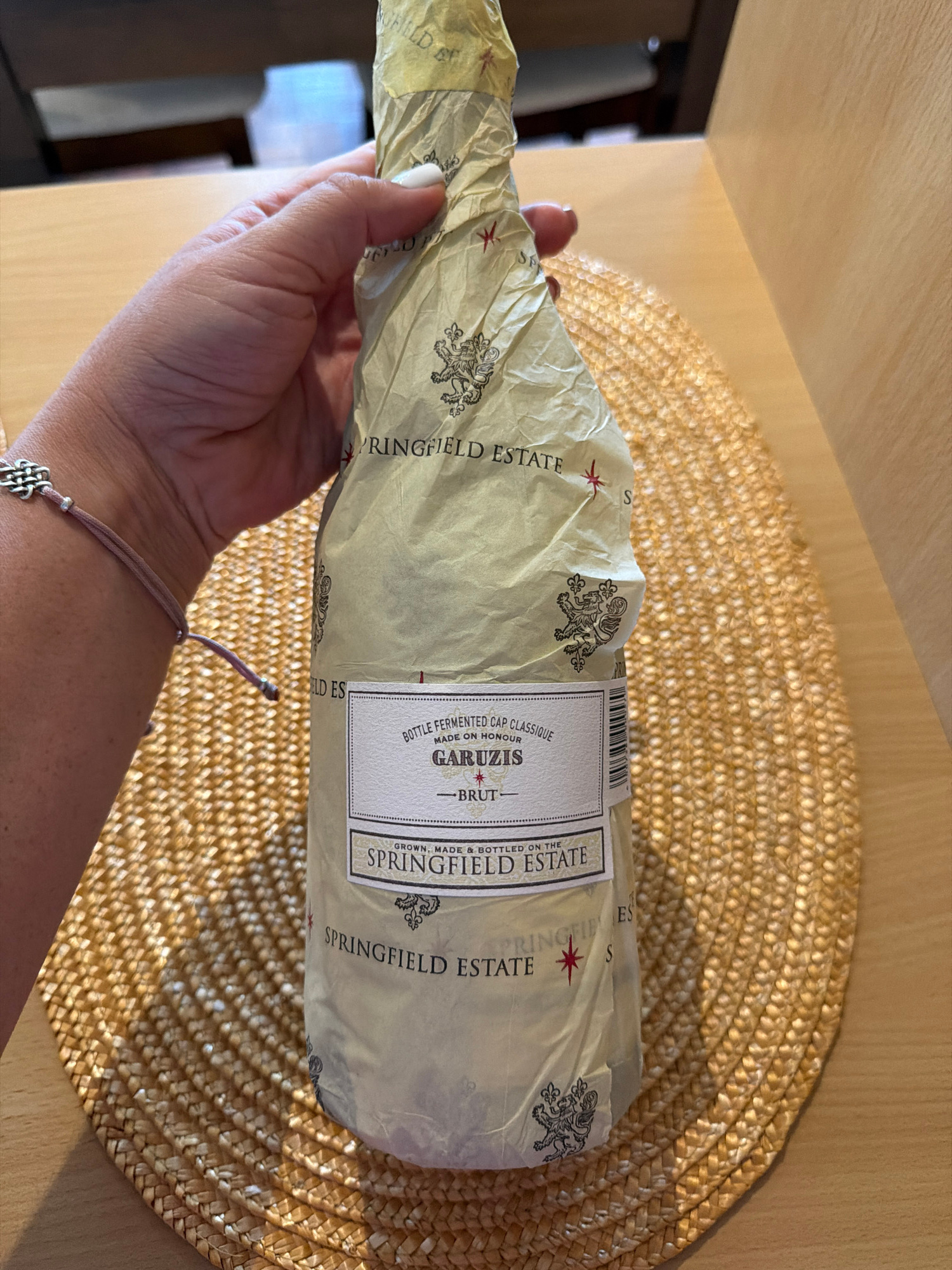 A person's hand holds a wrapped bottle in an indoor setting. The hand, adorned with white nail polish and a light pink string bracelet with a silver charm, supports a bottle wrapped in crumpled, light…read more