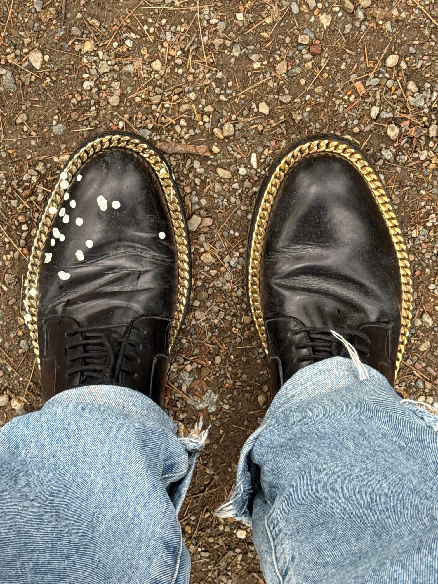 The image shows a downward-angled view of a person's feet standing on gravel and dirt. The person is wearing light blue jeans with frayed edges at the ankles. The jeans are cuffed above the ankles. Th…read more