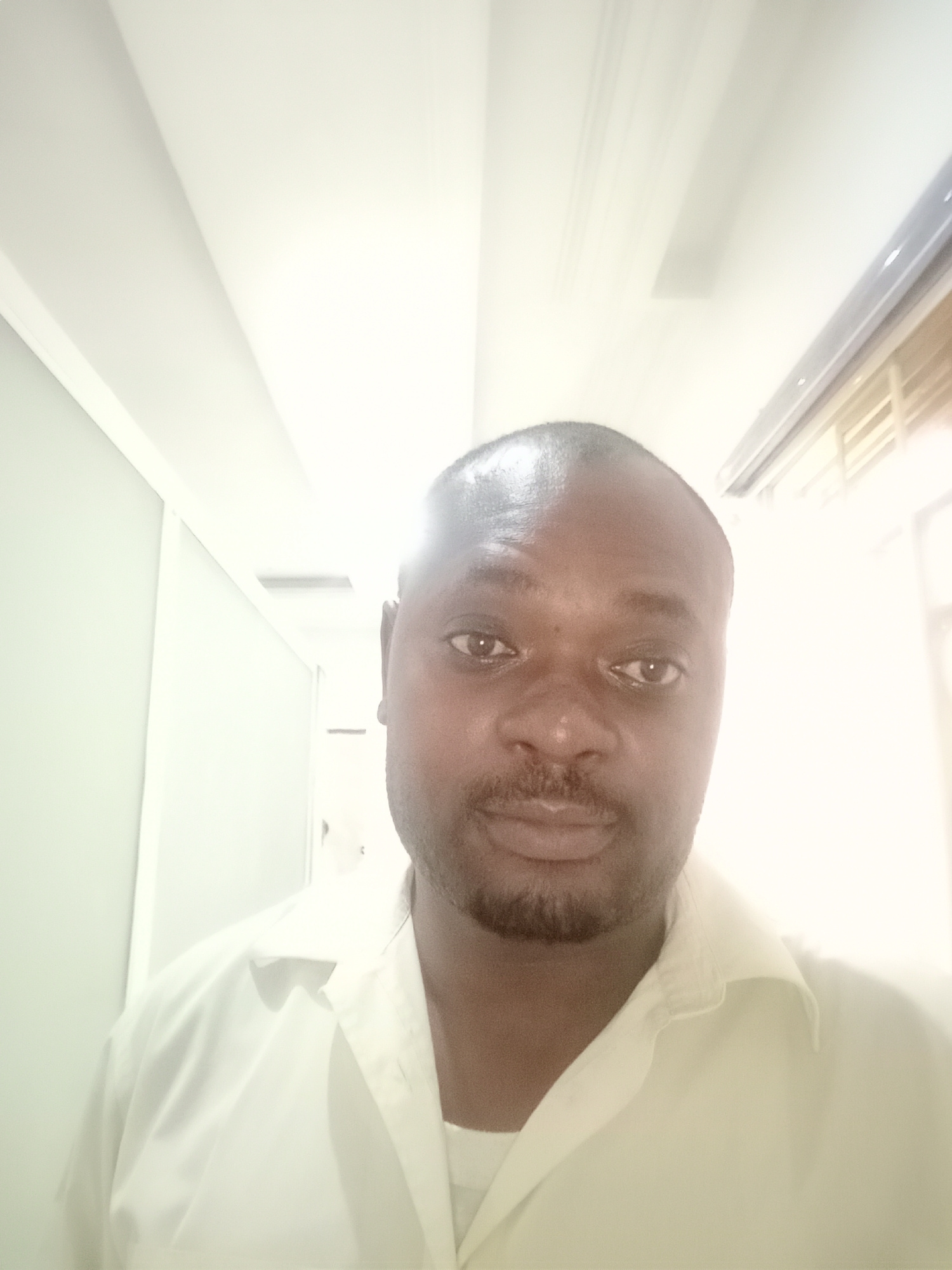 The image shows a head-and-shoulders self-portrait of a man with dark skin, a shaved head, and a short beard. He is wearing a light-colored collared shirt, possibly white. The background appears to be an indoor space, possibly a hallway or office, with light-colored walls and a white ceiling with recessed lighting. The location is described as Gwarinpa, Nigeria, but there are no specific details in the image to visually confirm the city. | Open Wire