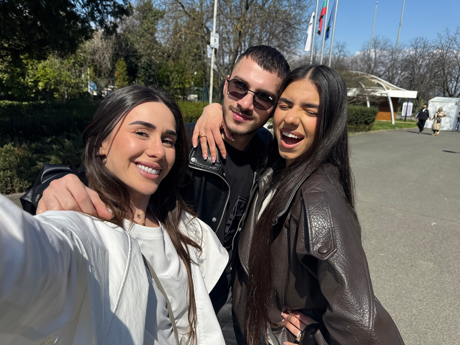 Three individuals are posing for a selfie outdoors on a sunny day. Two women flank a man in the center. The woman on the left wears a brown leather jacket, while the woman on the right is wearing a wh…read more