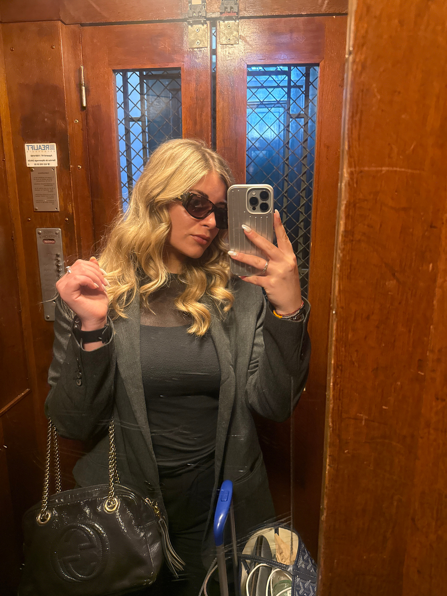 A fair-skinned woman with blonde curly hair and sunglasses takes a mirror selfie. She wears a grey blazer over a black top and has a black watch on her left wrist. She holds a silver iPhone with a cleβ¦read more