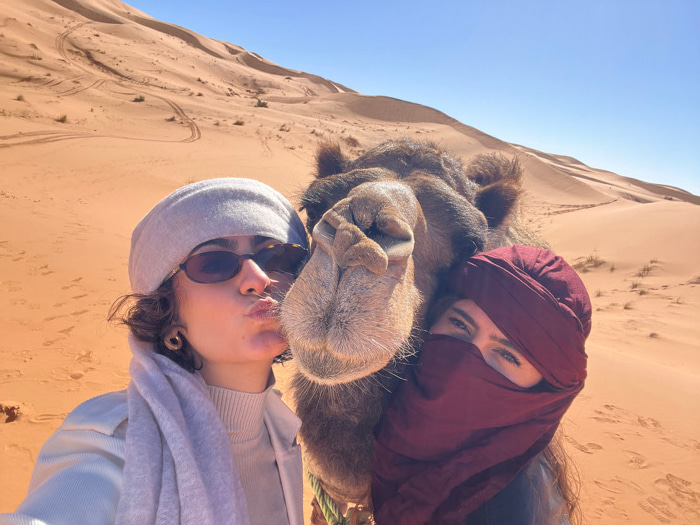 This close-up selfie captures two individuals and a brown Dromedary camel positioned against a backdrop of extensive sand dunes under a clear blue sky in the desert near Rissani, Morocco. On the left,…read more