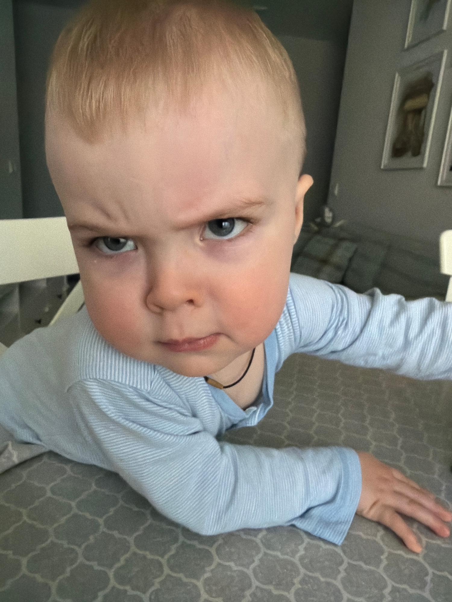 The image presents a close-up, top-down view of a baby or toddler, likely taken indoors in Votkinsk, Russia. The child, with fair skin, light blonde hair, and blue-grey eyes, is positioned diagonally…read more