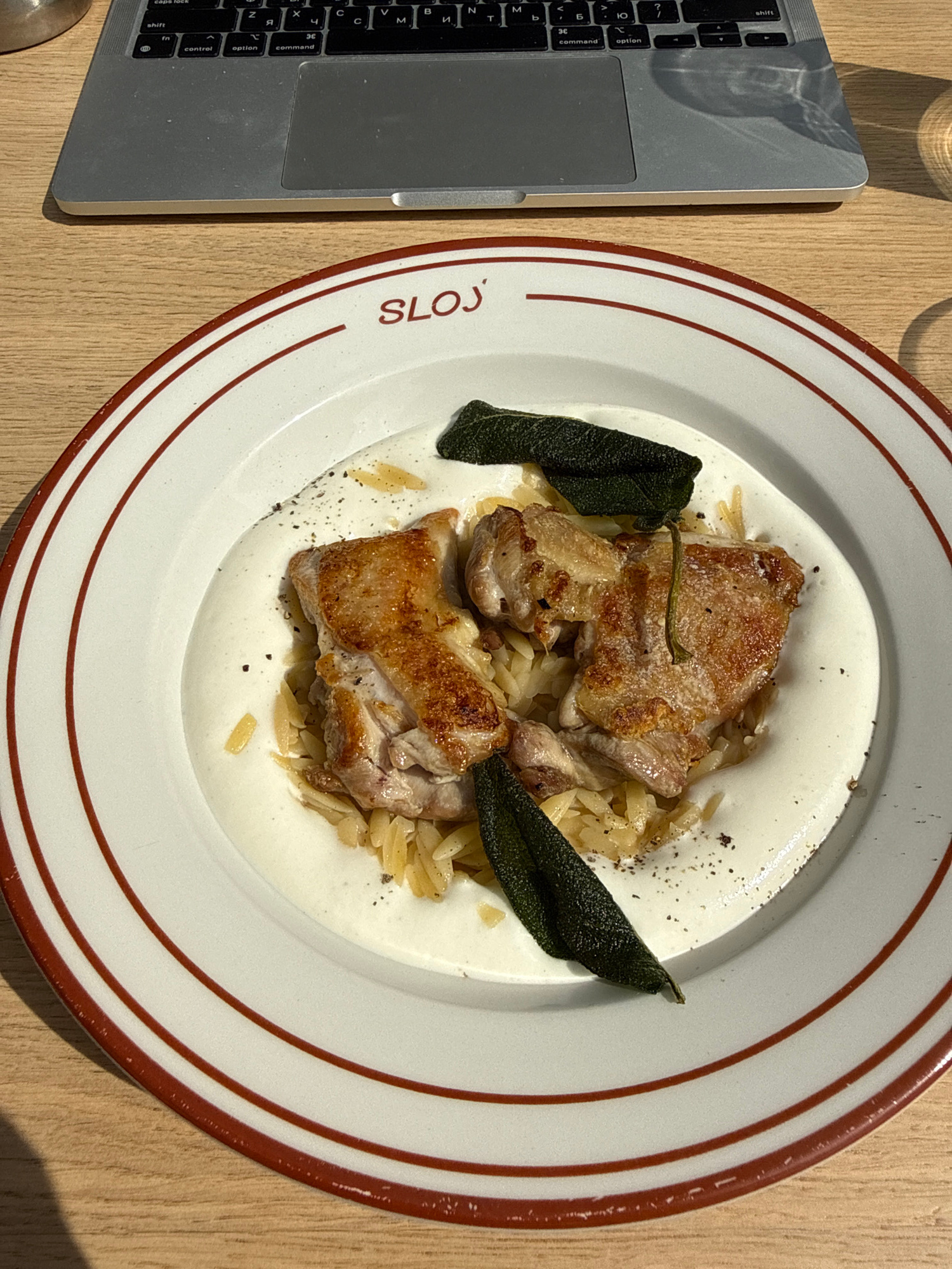 An overhead shot captures a meal set on a light-colored wooden table, illuminated by bright natural light that casts distinct shadows from a glass (partially visible) onto a nearby laptop. The main su…read more