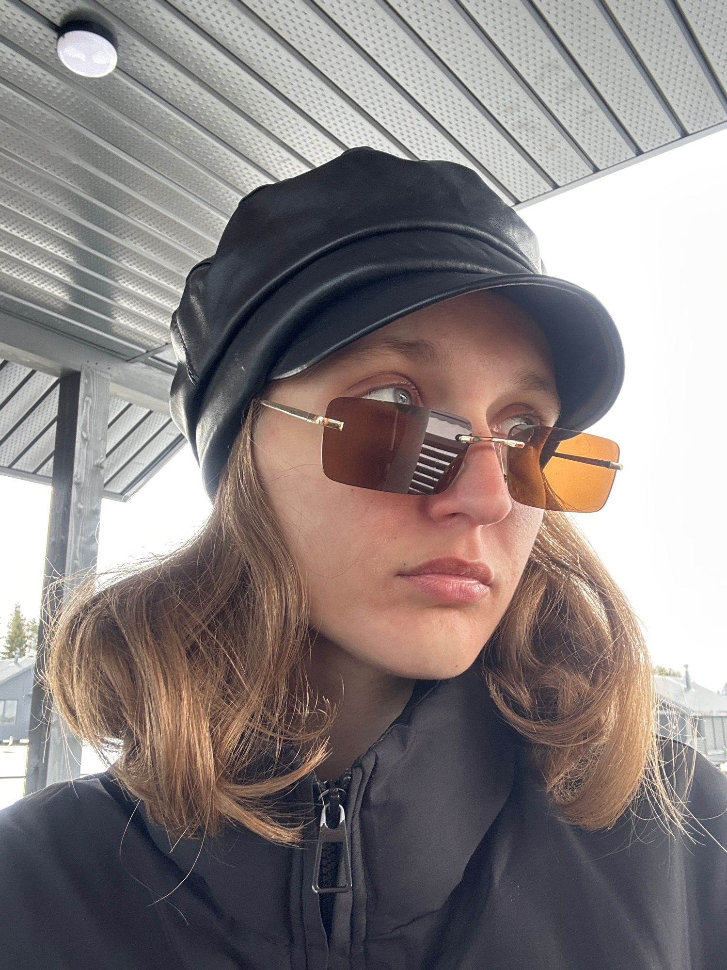 A person, likely female, is photographed in Подшивалово, Russia. She is wearing a black leather beret, brown rectangular sunglasses, and a black puffy jacket with a visible zipper. Her hair is brown a…read more