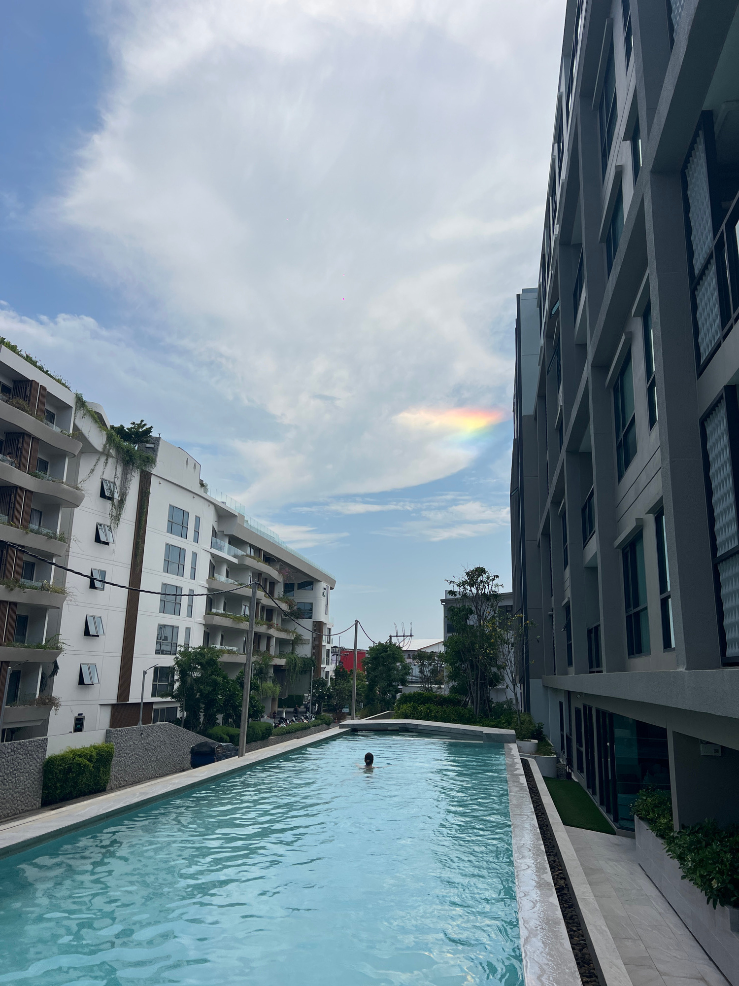A view from the ground of a long, narrow swimming pool located between two buildings, with a person swimming in the pool. The buildings appear to be apartments or condominiums, with one building showi…read more