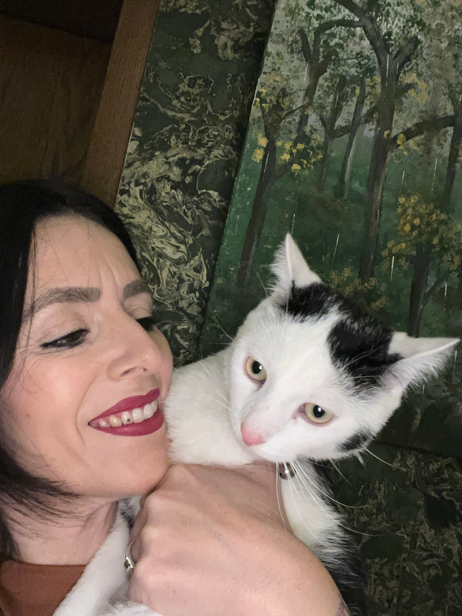 A woman with black hair and red lipstick is lying on a surface with a dark green marble pattern. A white cat with black markings is on top of her, its paw near her neck. The surface appears to be next…read more