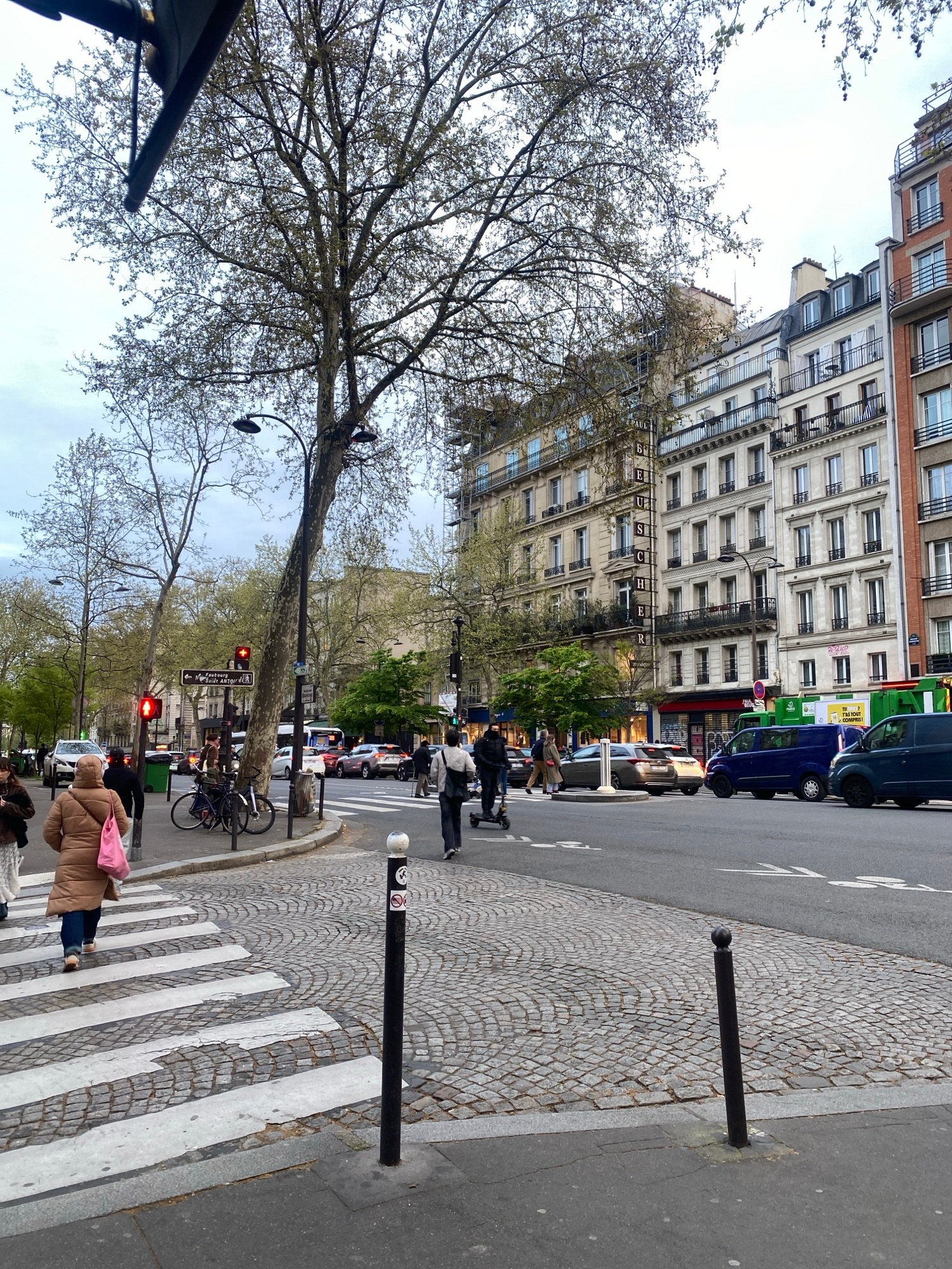 The image depicts an urban street scene at an intersection on Faubourg Saint Antoine in Paris, France, under an overcast, light blue-grey sky. In the foreground, a cobblestone-patterned street transit…read more