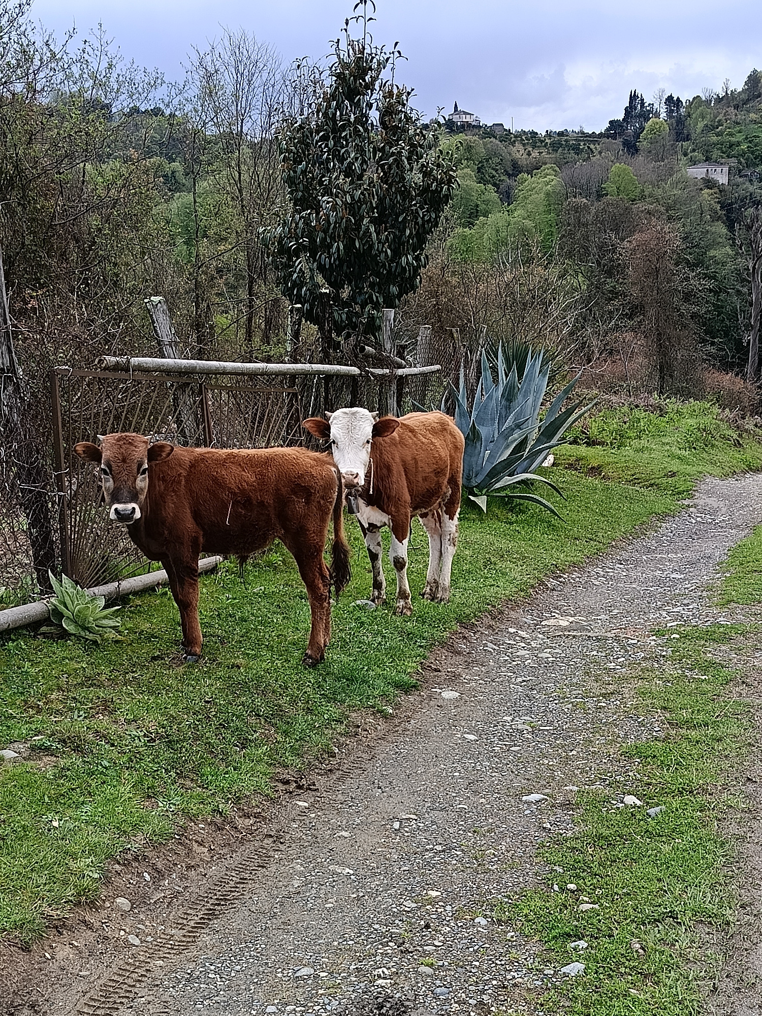 The image shows two young brown cows standing near a gravel path in a rural setting. A fence is visible behind the cows, along with a large agave plant. A hill with trees and a building are in the bac…read more