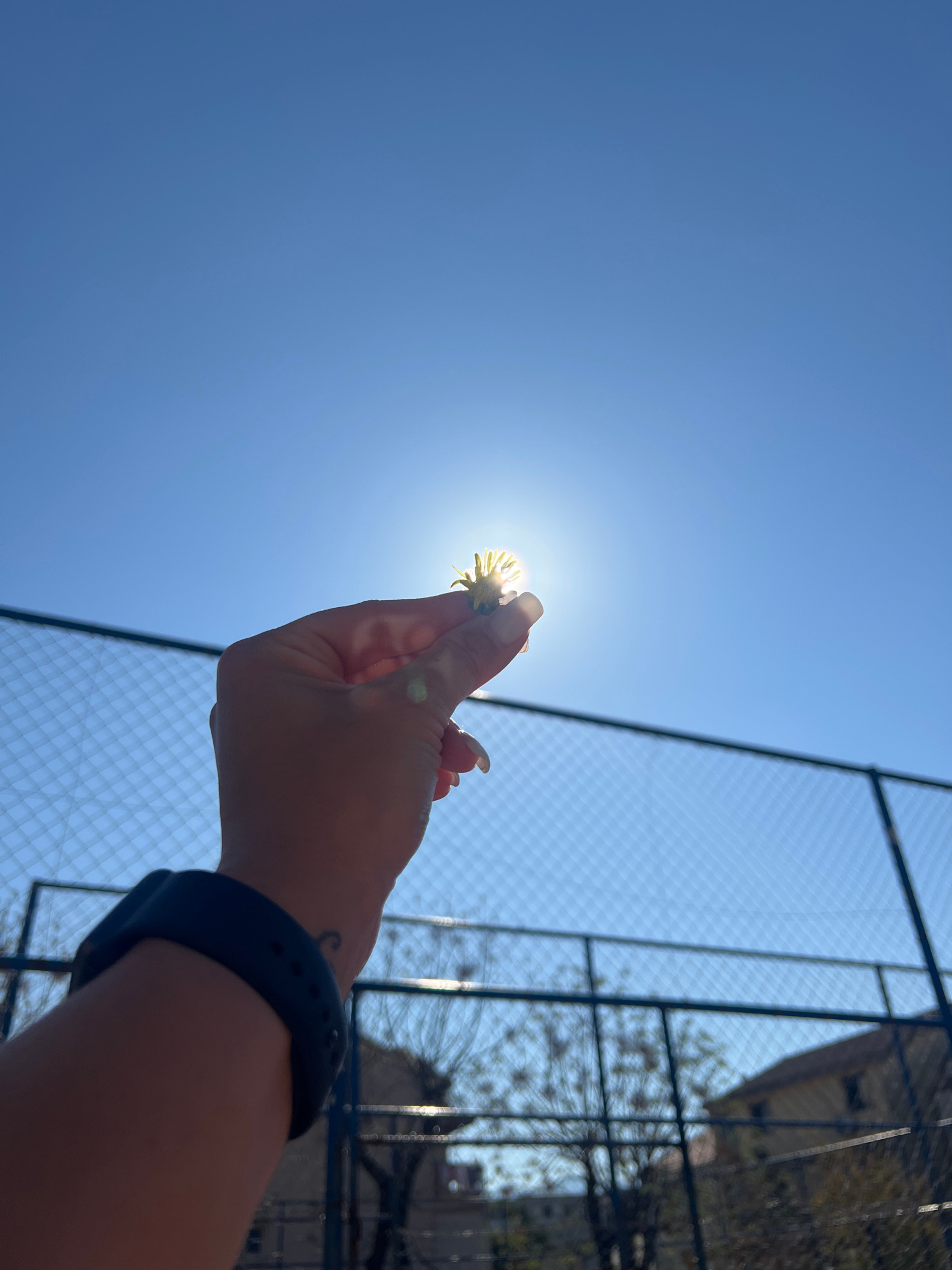 An upward-facing shot against a clear blue sky captures a fair-skinned hand holding a small yellow flower, obscuring the sun's light. The hand, wearing a dark-colored smartwatch, has manicured fingern…read more