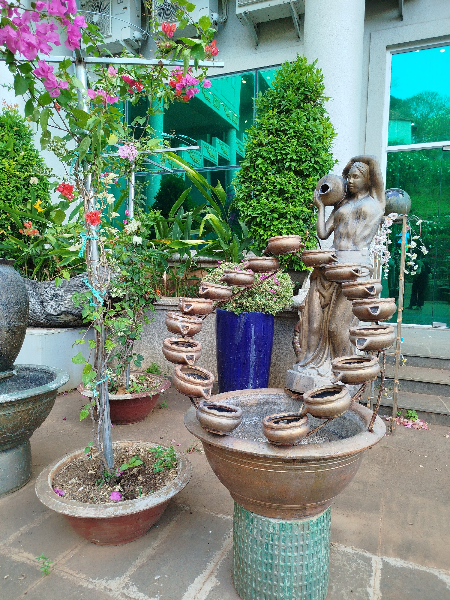 The image shows a garden scene in what is possibly Ho Chi Minh City, Vietnam. A multi-tiered fountain made of bronze-colored bowls dominates the view. It is positioned in front of a statue of a woman…read more